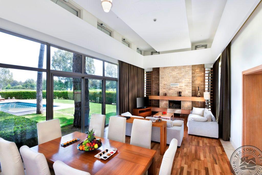 2 vieno aukšto Sultan Villa & Pasha Villa tipo vilos (su privačiu baseinu, su vaizdu į golfo lauką, svetainė, mini virtuvė, valgomojo stalas 6 asmenims, židinys, 3 miegamieji atskirti durimis, 3 vonios kambariai (vienas iš jų su sūkurine vonia), terasa su gultais, maks. 6 asm., 200 m2