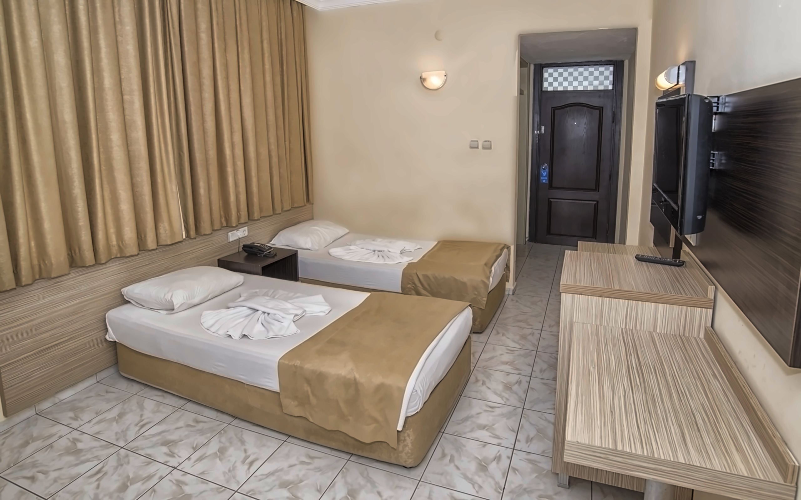 Comfortable hotel built in Mediterranean style. All rooms are equipped with a balcony, air conditioning, TV with satellite channels, safe, minibar, private bathroom with shower. It offers a restaurant, 2 bars, a swimming pool for adults and children, a gym, a sauna, a hammam. Near the hotel there is Red Tower (Kyzyl Kule), a museum and a fortress, as well as Cleopatra's beach, which is about a 20-minute walk away. Information about the structure and the number of rooms of the hotel: The hotel consists of one main building. The total number of rooms is 32.