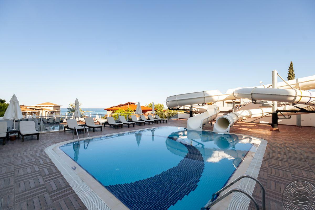 Vestibiulis maloniai kvepia, vyrauja šviesus baltas interjeras, o pro langus atsiveria graži panorama su vaizdu į jūrą. Seifas kambaryje kainuoja 2 eurus per dieną, o mini bare yra tik vanduo. Family tipo kambariai yra gana tamsūs ir daugiausiai talpina 2 suaugusiuosius, 2 vaikus ir 1 kūdikį. Iki jūros yra apie 150 metrų, tačiau kelias žemyn gana status – yra nemokamas shuttle autobusas nuo 10 val. ryto. Viešbutyje yra du a la carte restoranai, kuriuose kiekvienas svečias gali nemokamai apsilankyti vieną kartą per viešnagę. Šildomų ar uždarų baseinų nėra, tačiau yra vienas ramus „relax“ baseinas, kuriame nesigirdi muzika. Paplūdimys labai gražus, su smulkiais akmenukais, puikiai tinkantis komfortiškam poilsiui.