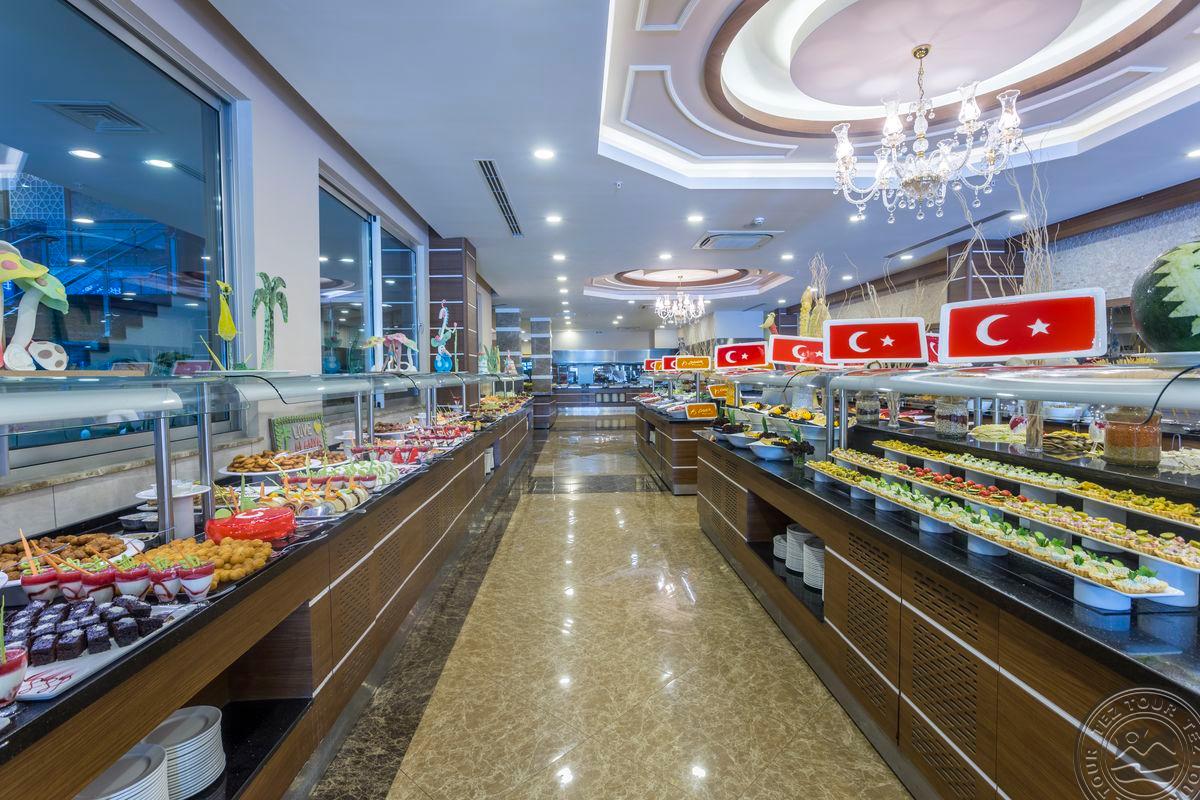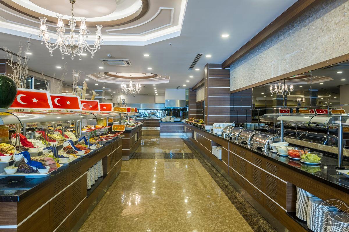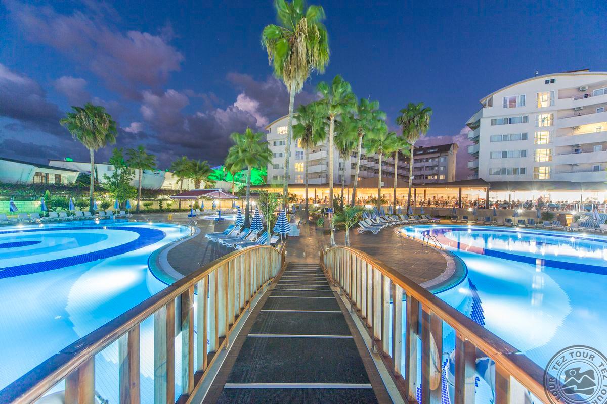Didelė ir pakankamai graži teritorija. Aktyvus viešbutis su daugybe pramogų ir veiksmo. Yra 5 baseinai, 2 šildomi lauke, didelis aqua parkas įvairaus amžiaus vaikams. Prie didelio baseino daug gultų ir žmonių, garsiai groja muzika. Prie aqua parko yra ledų baras, galima gauti ledų tam tikromis valandomis vafliniame indelyje. Yra didelis vaikų klubas nuo 4 metų su prižiūrėtojais. Mergaitėms pina kasytes. Viešbutyje yra parduotuvės. Yra 1 a la carte, kuris dirba nuo 05 15 iki 10 15. Yra latte dinner bufetas ir late night bufetas. Nėra pirso, bet paplūdimys skaitomas geriausias Alanijoje, smėliukas su lėtai gilėjančiu krantu, todėl labai gerai su mažais vaikais, pats paplūdimys gan siauras, bet ilgas. Animacija vyksta 6 kartus per savaitę.