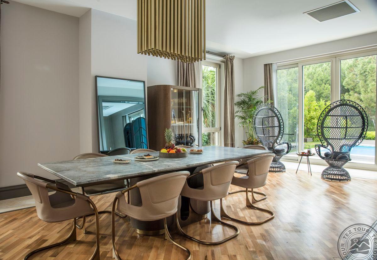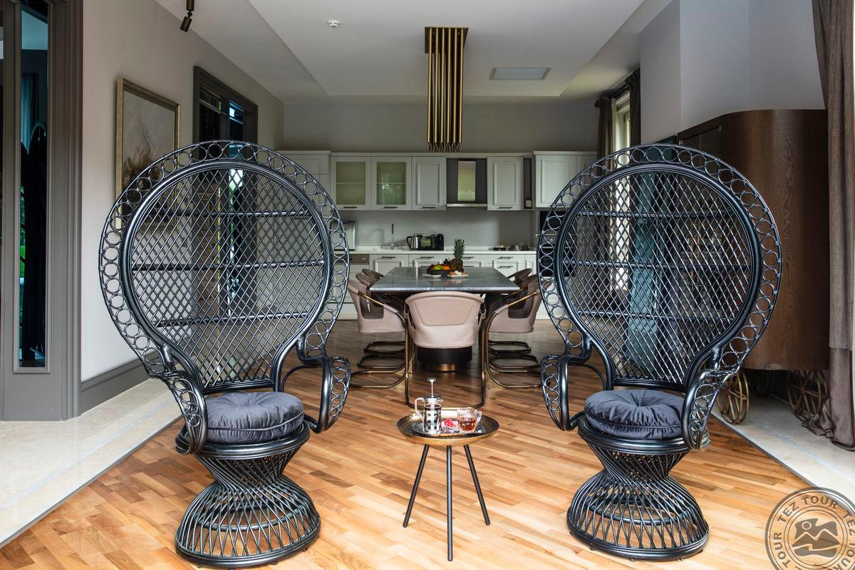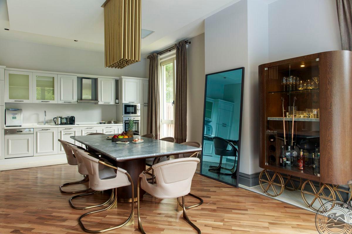 1 dviejų aukštų Presidential Villa tipo vila (pirmame aukšte: nuosavas atviras baseinas (žiemos sezonu šildomas), svetainė, valgomojo zona, holas, virtuvė, vonios kambarys su sauna ir dušu, terasa; antrame aukšte: 4 miegamieji atskirti durimis, turkiška pirtis, 4 vonios kambariai: du su sūkurine vonia ir dušu, du su dušu, maks. 12 asm. + kūdikis, 630 m2, VIP-aptarnavimas).