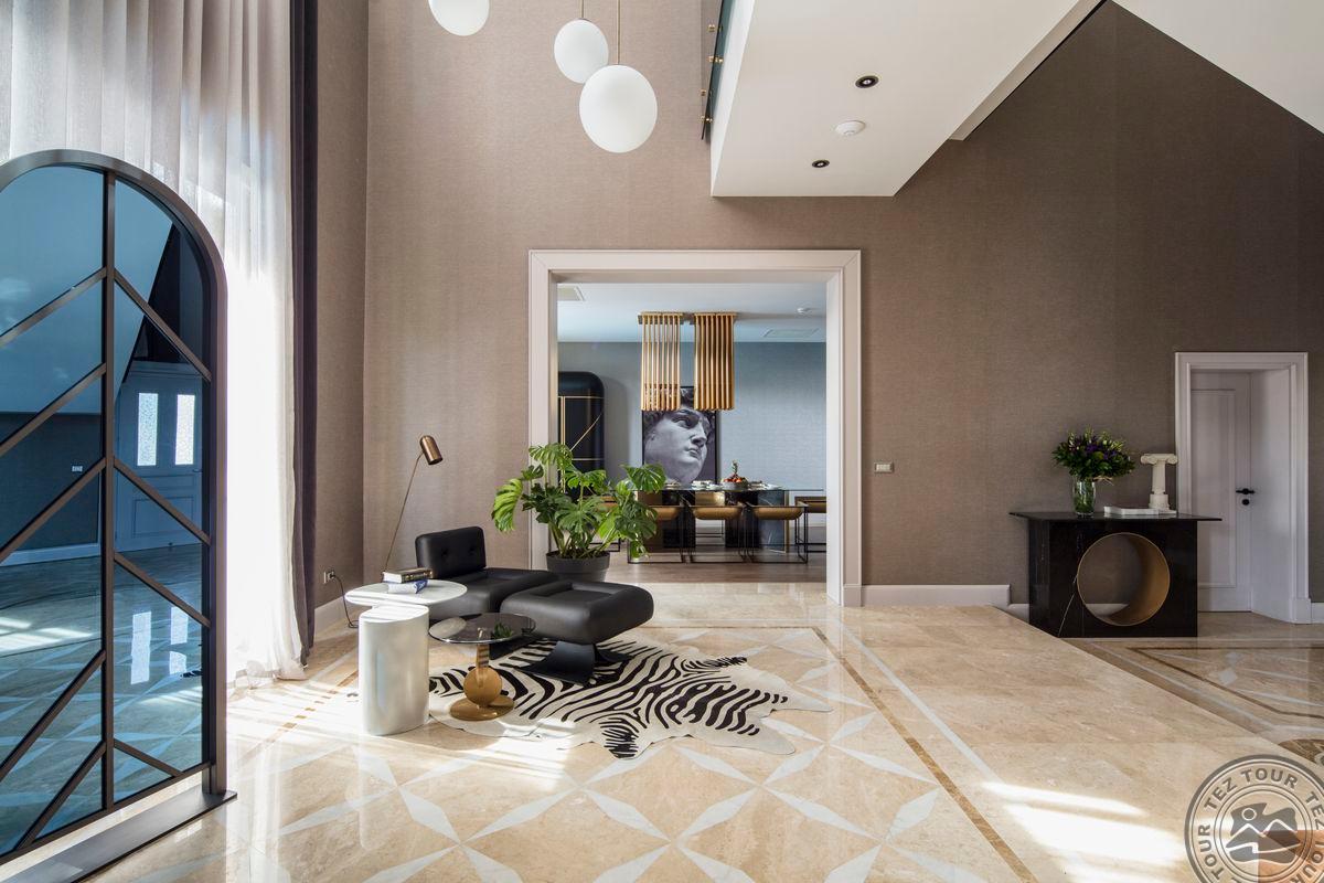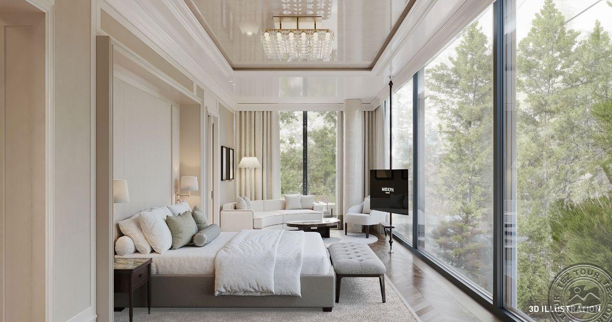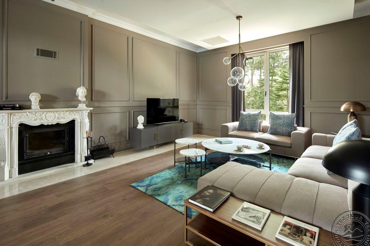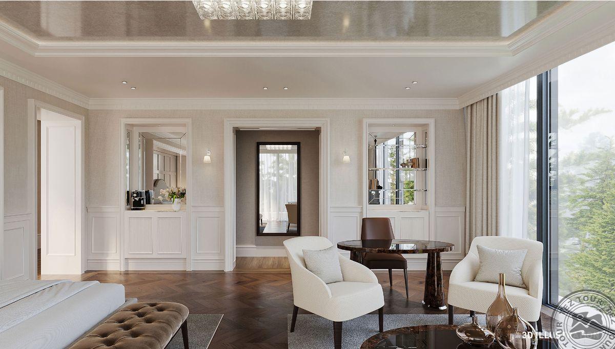 1 dviejų aukštų Presidential Villa tipo vila (pirmame aukšte: nuosavas atviras baseinas (žiemos sezonu šildomas), svetainė, valgomojo zona, holas, virtuvė, vonios kambarys su sauna ir dušu, terasa; antrame aukšte: 4 miegamieji atskirti durimis, turkiška pirtis, 4 vonios kambariai: du su sūkurine vonia ir dušu, du su dušu, maks. 12 asm. + kūdikis, 630 m2, VIP-aptarnavimas).