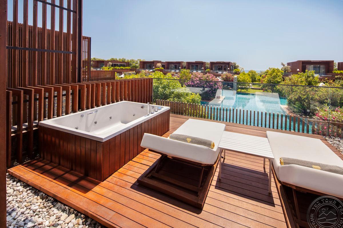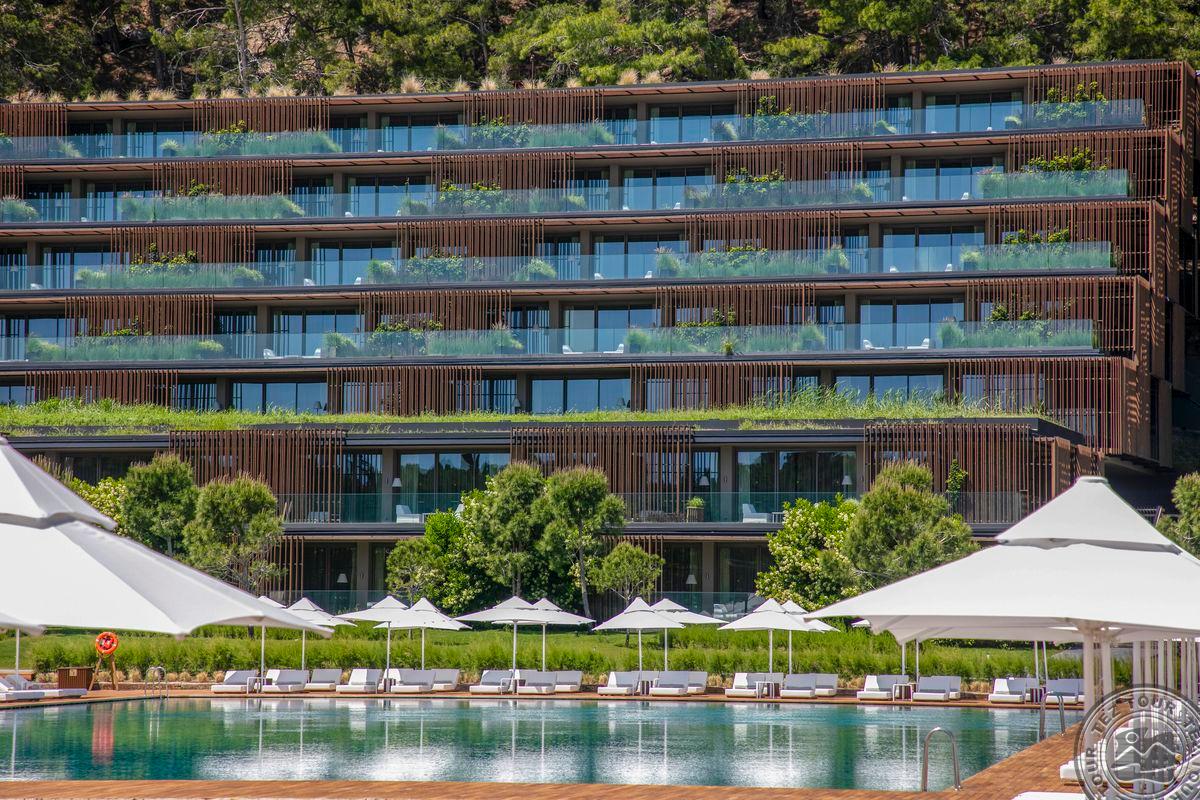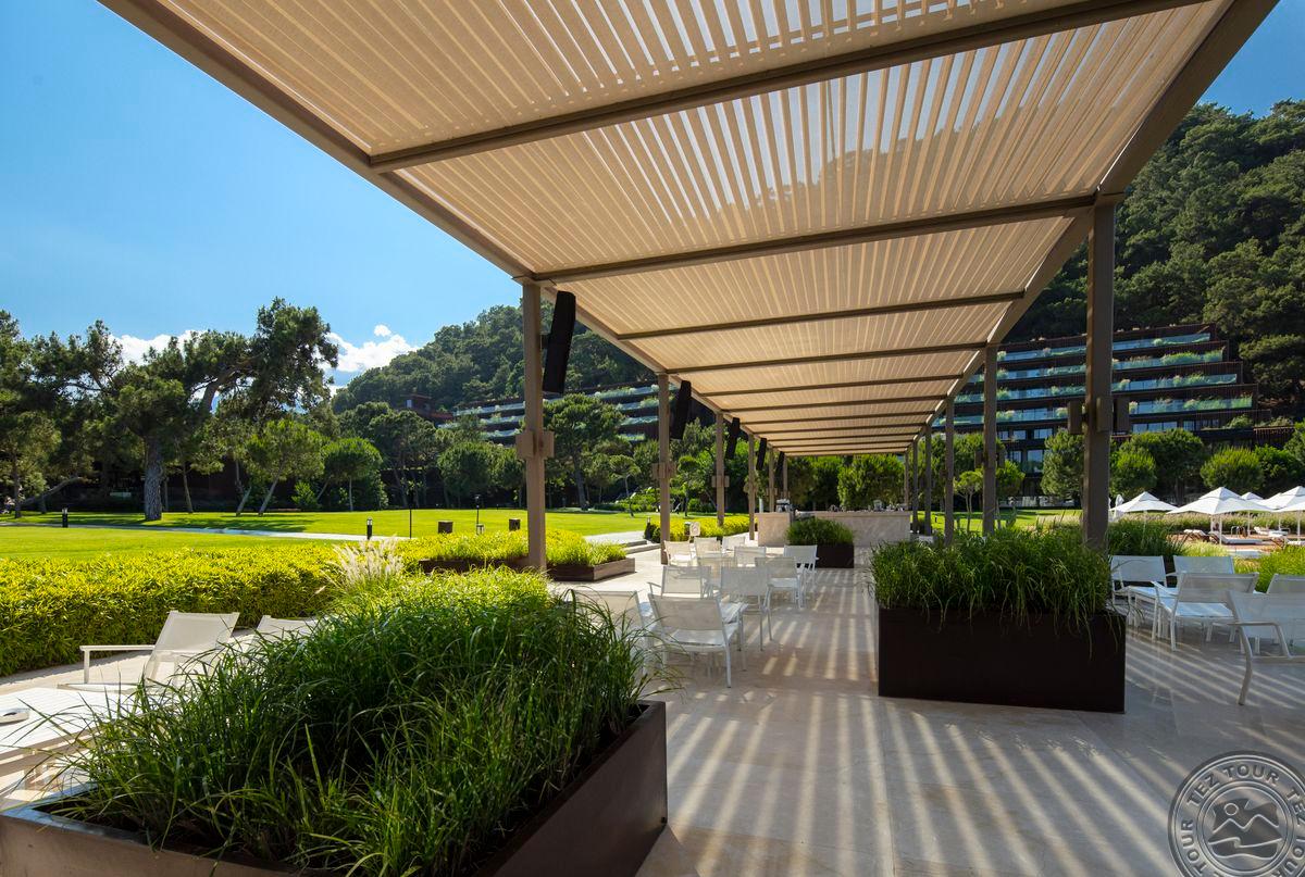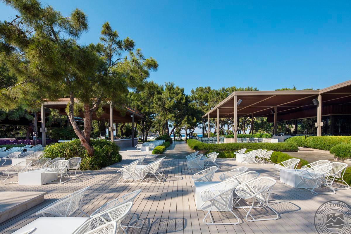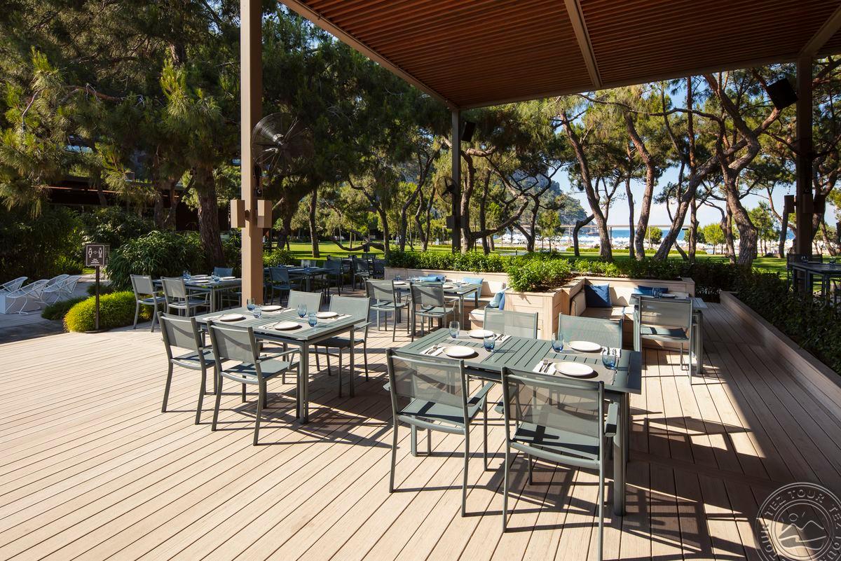 Geriausias Turkijos viešbutis. Jauki atmosfera. Labai žalia, labai gražu. Kompaktiška, aiški teritorija. Joje labai ramu, vaikšto ožkytės ir valgo žolytę. 80 % svečių yra rusai, 10 % – turkai, bet jų būna ir daugiau. Yra asistentai. Padavėjai važinėja riedučiais. Personalas kalba rusiškai, angliškai. Labai prabangi išorė. Labai erdvi, tamsi, prabangi fojė zona, joje gamina šokoladą. Fojė baras dirba visą parą. Šeimyniniuose kambariuose yra papildomas miegamasis vaikams, sūkurinė vonia, lauke auga augaliukai. 15 paplūdimio vilų su baseinais. Lagoon tipo numeriai gauna pusryčius į kambarį, turi kabanas. Iš viešbučio ant kalno galima pamatyti kalnų ožius. Iš baseinų matosi labai gražus vaizdas. Silent baseine nėra animacijų, maisto. Gilesni baseinai šildomi. Daug gultų ant žolės. Vandens pramogų parkas dirba nuo 10 iki 18 val., mažesnius vaikus turi prižiūrėti tėvai. Naktinis klubas yra atviroj erdvėj, ant jūros kranto. Pagrindinis restoranas dirba visą parą. Yra restoranas su „Michelin“ žvaigždutės šefu, sušių restoranas (stengiamasi išlaikyti aukštą lygį). Vietoje auginamos alyvuogės. Mini klubas dirba iki 2 val. Vandens sportas, laipiojimas uolomis šalia jūros. Nemokama teniso aikštelė su įranga. Yra sraigtasparnių nusileidimo aikštelė. Didelis ramus paplūdimys. Daug vietos, labai gražu, žvyriukas. Kitas paplūdimys labai ilgas.
