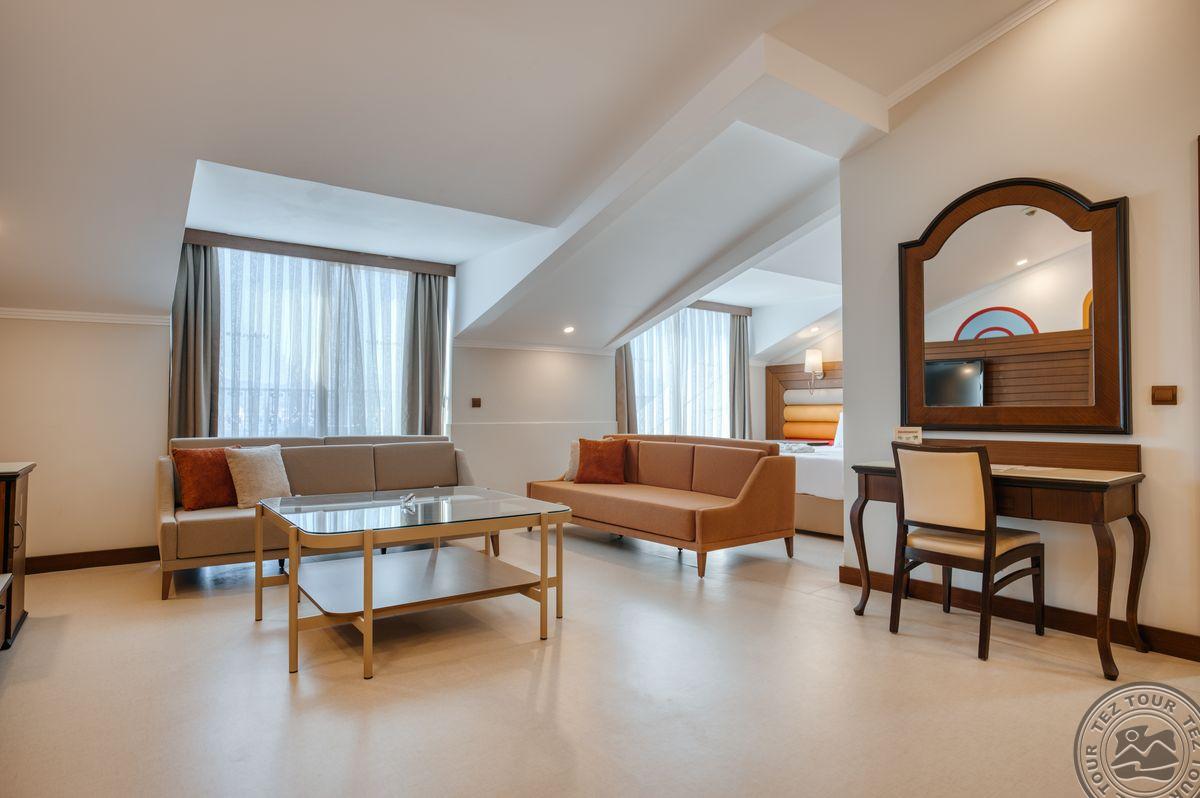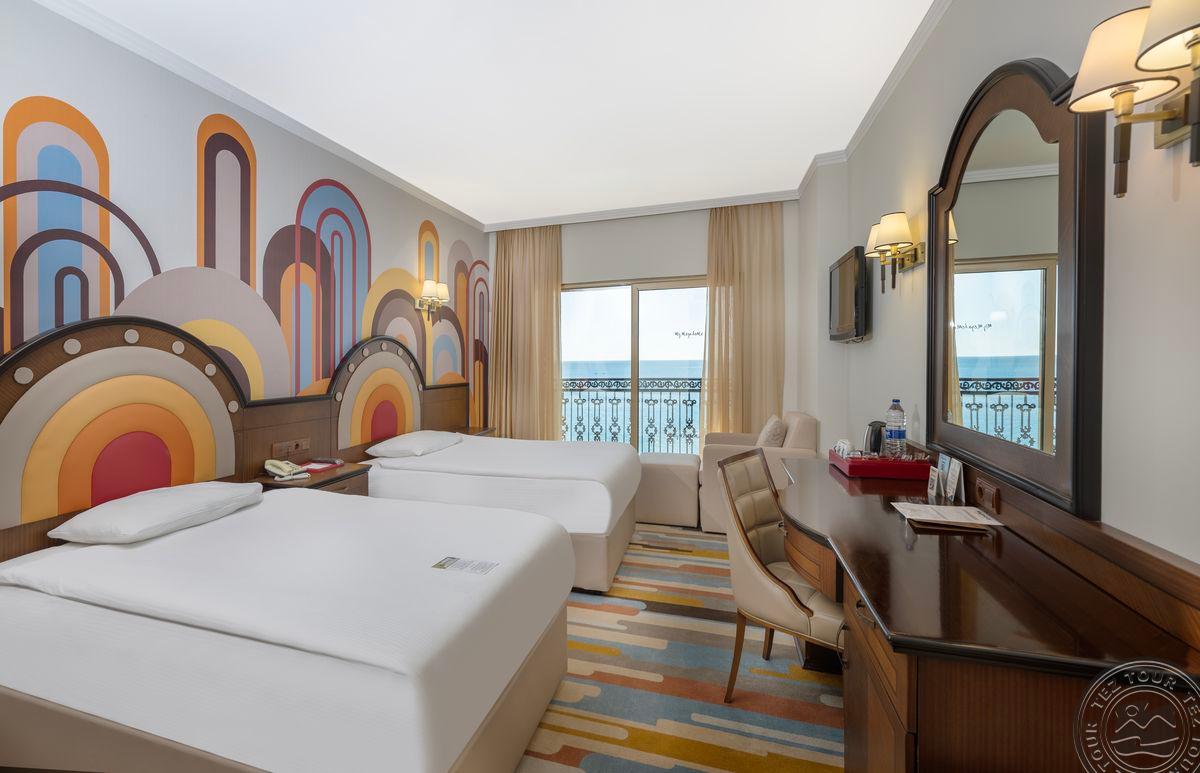 121 dviejų kambarių family room tipo numeris (kampinis numeris su vaizdu į jūrą, 2 miegamieji atskirti durimis, maks. 3+1 asm., 44 m2).