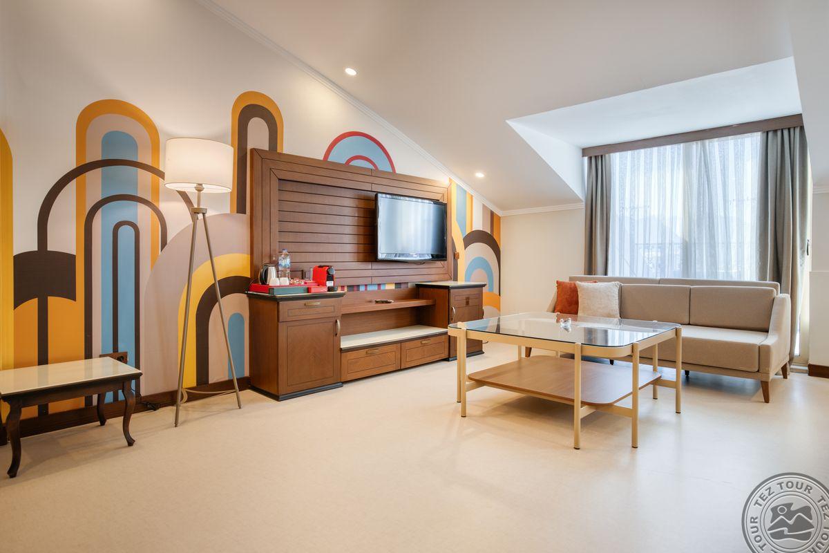 Junior Suite tipo numeriai (1 miegamasis su svetaine, kampinis numeris su vaizdu į jūrą arba kalnus, maks. 2 asm., 60 m2).
