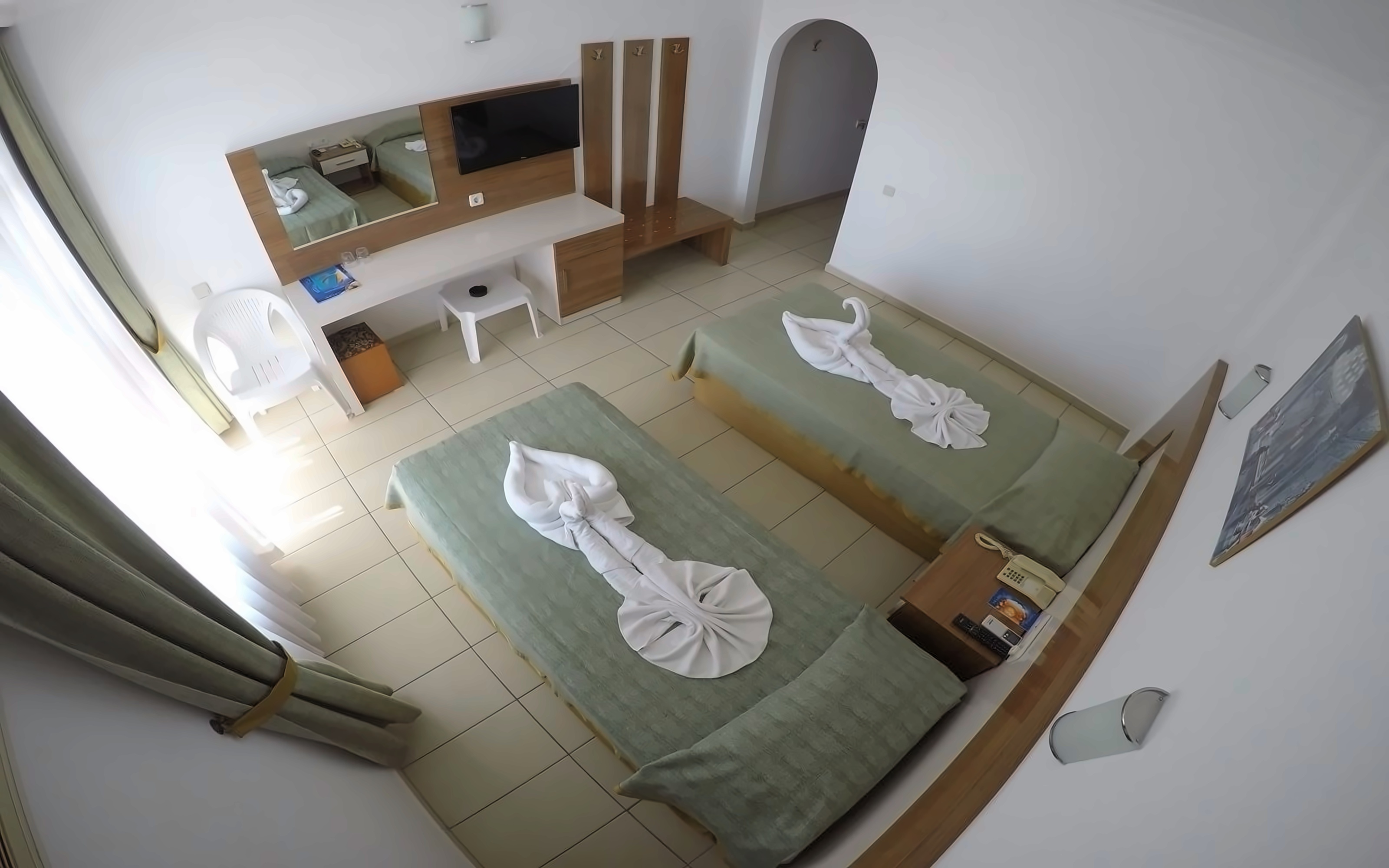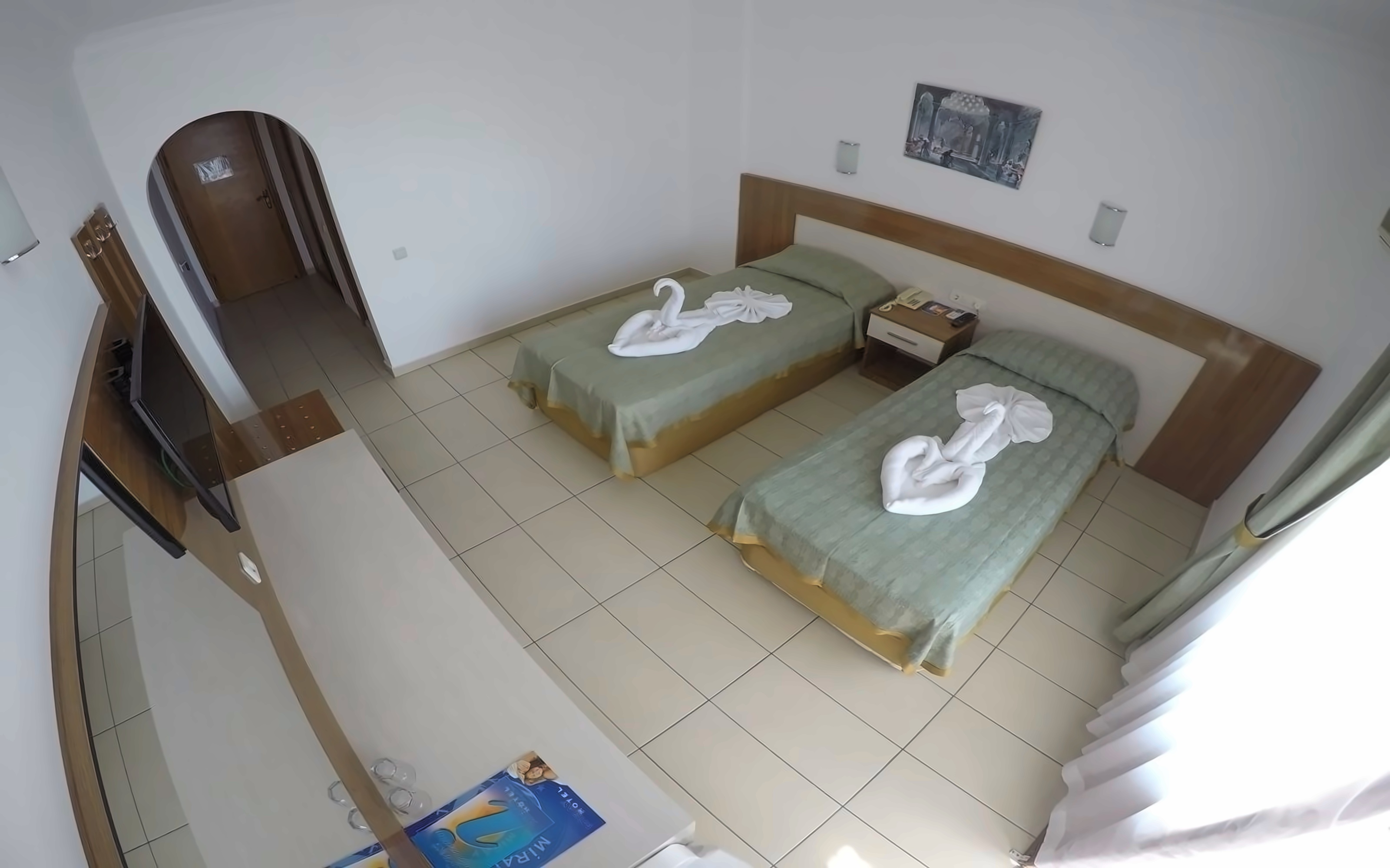 The hotel has 54 rooms (4 family rooms). All rooms with shower / toilet, direct dial telephone, TV (satellite broadcast), split air conditioning, fan, safe, music broadcast, balcony and sea view. Restaurant for 150 people and a'la carte restaurant for 40 people, lobby bar, bar-restaurant, beach bar, pool bar. Among the services there is an outdoor pool with a children's section, a doctor's office, a massage room, an internet room and a TV area. Leisure activities include: table tennis, darts, billiards, all water sports, beach volleyball, running, diving school, animation for children.