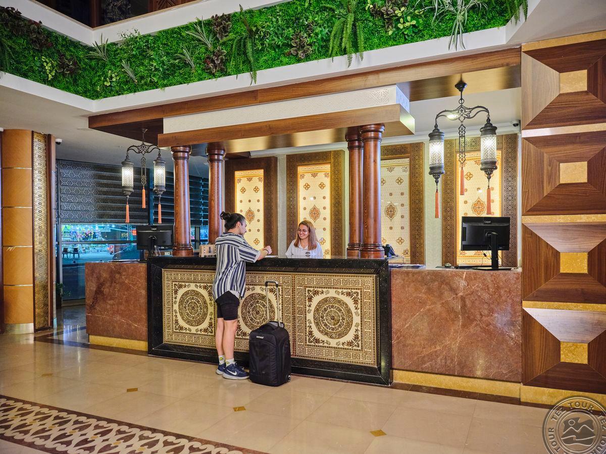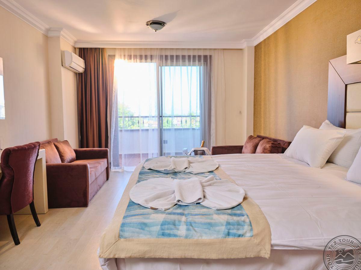 Замечательное впечатление от начала и до конца. Отдыхали 2 недели (16 июля по 30 июля). Прилетели раньше 14.00 (заселение), получили браслеты сразу и пошли есть. После обеда сразу заселили. Очень приятный персонал!!! (везде и всегда, постоянная улыбка, милые). Денег никому мы не сували Номер чистый, вода, соки, кофе, чай, чайник, фен, сейф бесплатный. Вид на море. Все работает. Матрас супер! Подушки хотелось бы тоньше. Постель, полотенца чистые. Номер убирался каждый день, большие полотенца менялись каждый день!!! Полотенца для пляжа меняли во вторник, четверг, суббота (несли сами, на 0 этаже.) О еде - очень вкусно, много, нет очередей, все блюда докладываются, нет суеты, много столов и много мест для этого (на воздухе с разных сторон здания), внутри здания, в апельсиновом саду (супер место, где можно самостоятельно собрать себе бургер, мороженное, гозельме (бабуля тут же печет), фрукты всегда (арбузы, дыни, персики, сливы, черешня, абрикосы, виноград). Вода везде в стандартных 200мл упаковках (удобно). Удивило, как парни стараются моментально забрать пустую тарелку, все время протирают столы, стулья, пол. Уборка на 5 + везде. В отеле платно только массаж. Баня есть и тут же выход во внутренний бассейн (очень хороший и не маленький). Напитки - пили вино красное и белое, и розовое - хорошее! Пили джин плюс тоник (отлично). Выбор большой. Наливают из бутылок все. Крепкое у них сразу дозировано по маленьким бутылочкам по 50 гр.и не придерешься , что налили мало или наглаз. Бармены умнички, приятные. Еще про еду - всегда мясо и много (индюшатина, курица на гриле и тушеная ,говядина, печенка на гриле). При этом мясо присутствует в тушеной картошке, овощах, в баклажанах. Был кебаб и его закручивали в лаваш. Всегда выбор мяса. Рис, перловка, спагетти, макарошки, картошка фри. Запеченная картошка, баклажаны, цукинии, перцы. Салаты разные. Рыба всегда практически - красная, еще какая то на гриле. Сладость - много и вкусна, торты, все не сладкое ( за исключением их местной сладости политой медом). К морю можно идти, а можно подьехать. Мы всегда ходили и проехали только раз, для интереса. Идти 5 мин. Реально недалеко, хоть немного походить то надо!) Пляж - слабое место. Но! Пирс на море и на нем лежаки ,с пирса лестница в море на глубину. Мы плавали с дочкой , классно, детям лучше нарукавники и нет проблем. У пирса лежаки тоже. Не доходя до пирса кафе в котором есть (бургеры, фрукты, луковые кольца, напитки). Также там туалет (чистый очень, комфортный), колонка для обмывания, столики под навесом, ну и опять лежаки). Лежаки двух видов -натяжные (мягкие) и пластиковые. Матрасов нет, нужны полотенца. Мы носили с собой. один раз одно полотенце нам сдул ветер ночью с балкона, мы спустились вниз и обьяснили ситуацию (боялись, что теперь за него надо платить, так как его никто не нашел), но нам сразу выдали новое. Все ок. Когда пропал детский круг, персонал начал его дружно искать на территории отеля. Удивили. ПО пяжу подскажу - 50 метров(на лево, если смотреть на море) от отельного нашего пляжа, есть пляж гостиницы ARIA. На нем лежак занимать нельзя, но купаются все. Мы ходили постоянно, там песок и спокойная тихая вода, отличная постепенная глубина. Сказка! А 70 метров от нашего пяжа есть другой отель(АНИТАС) , там небольшой пляж, но всегда волны (тоже классный). Мы на своем пляже (всегда есть свободные) занимали лежаки и потом бро