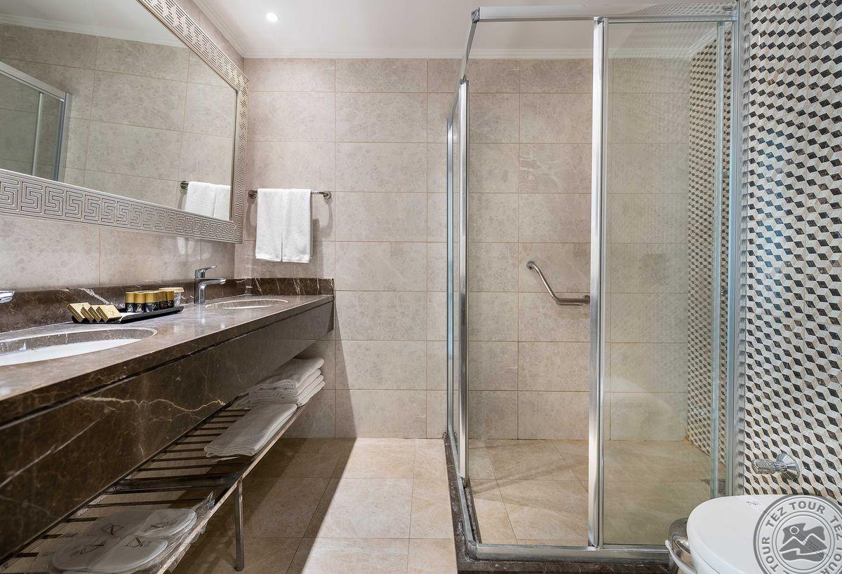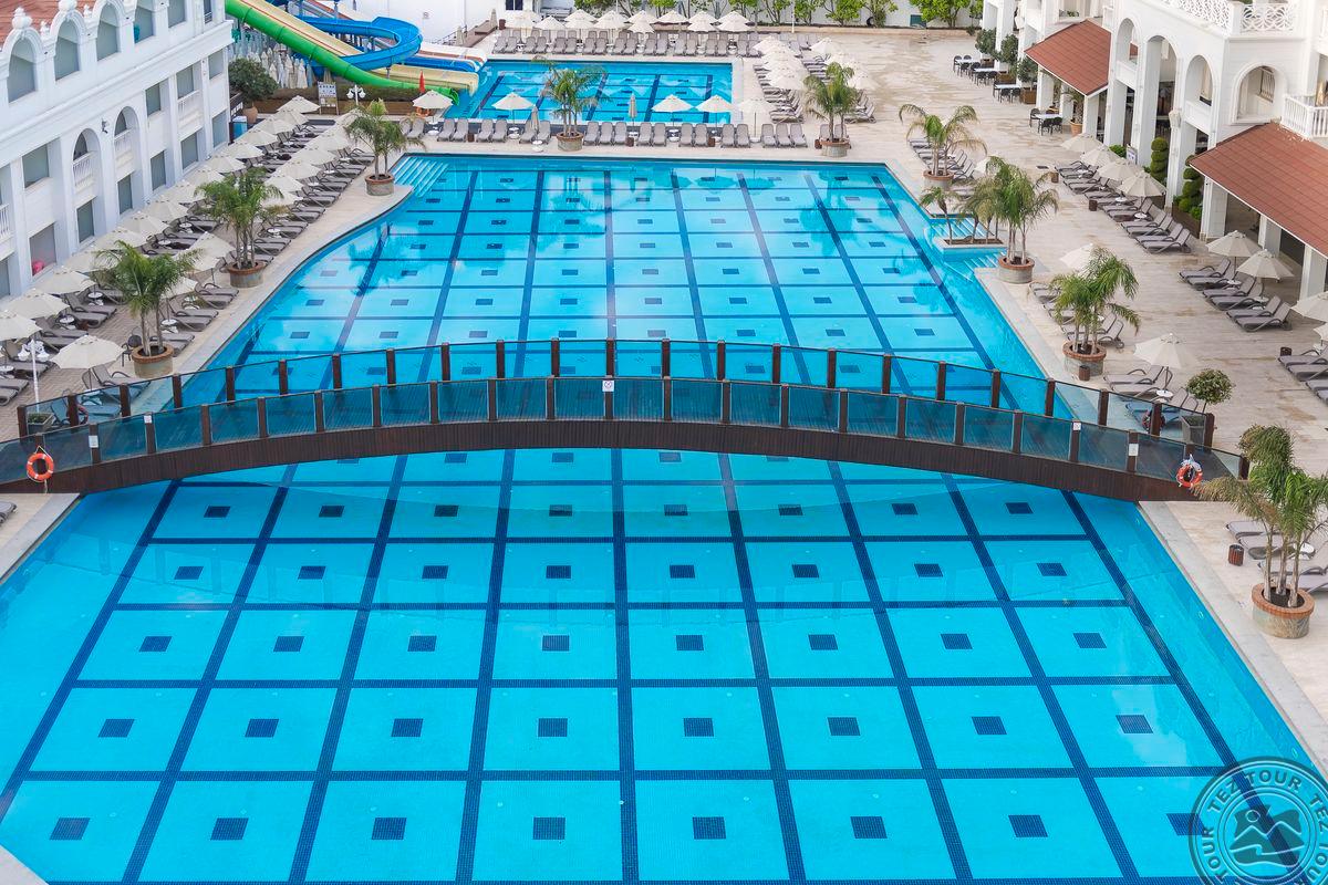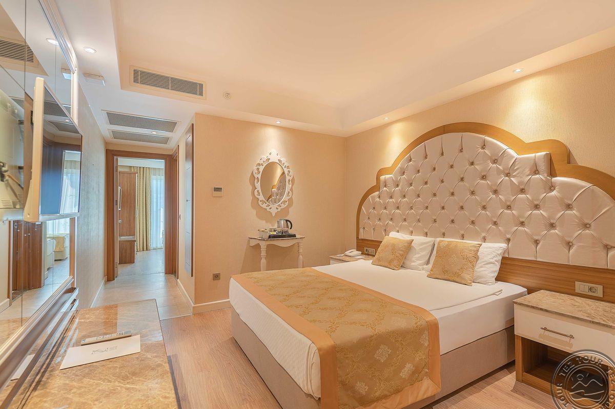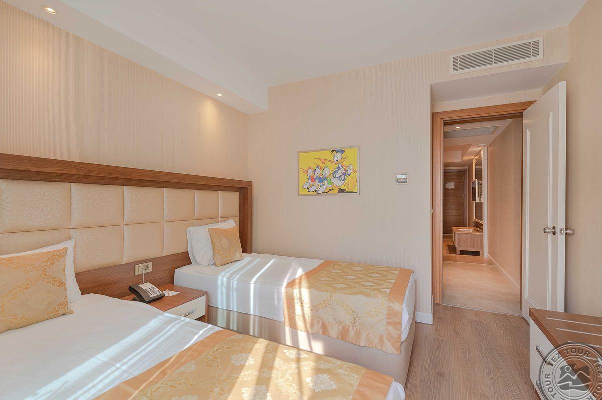 48 dviejų kambarių family rooms tipo numeriai (2 miegamieji atskirti durimis, tėvų miegamasis be langų, 1 vonios kambarys, su vaizdu į baseiną, maks. 4 asm., 45 m2).