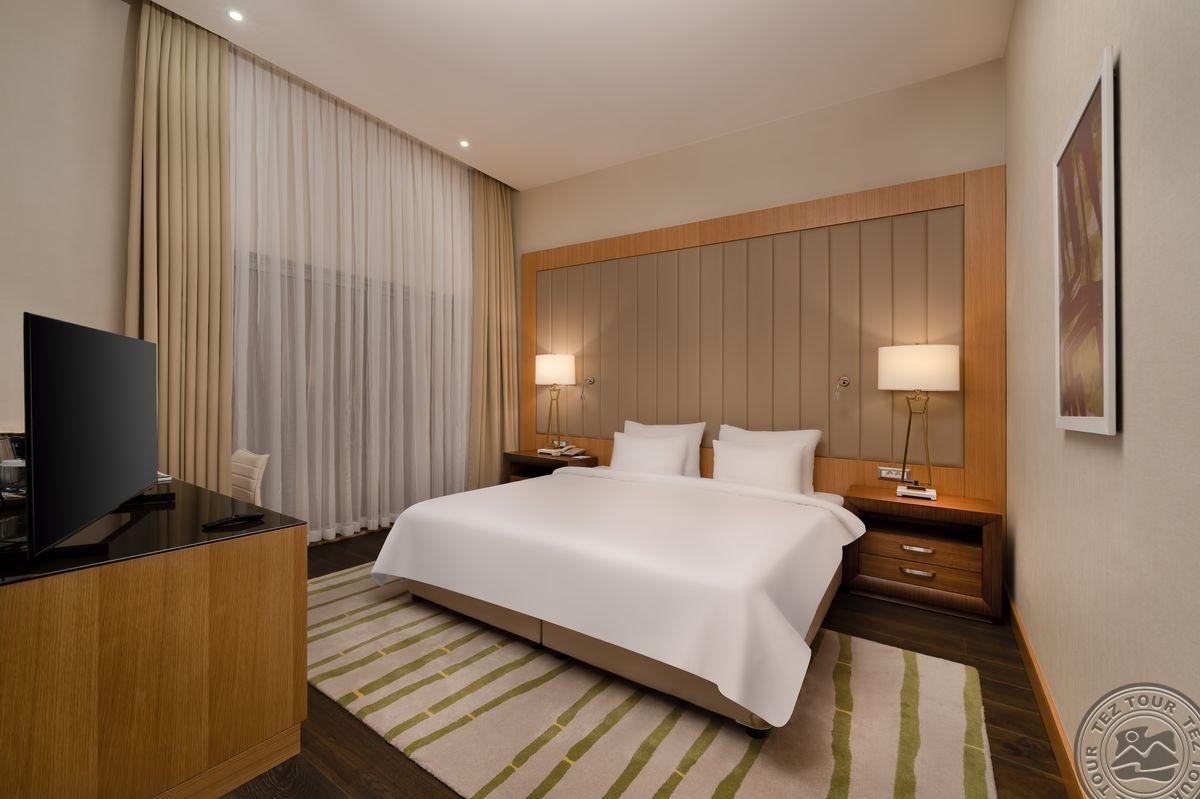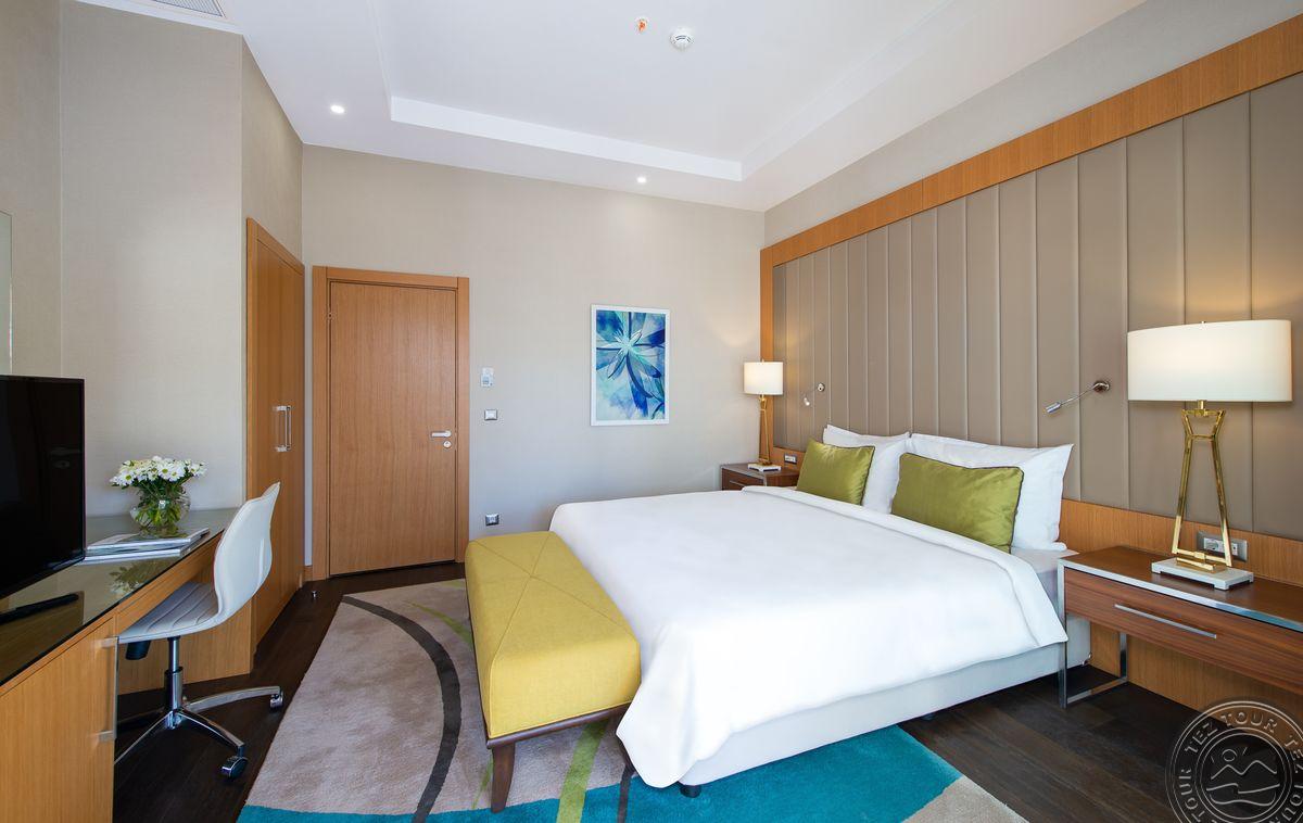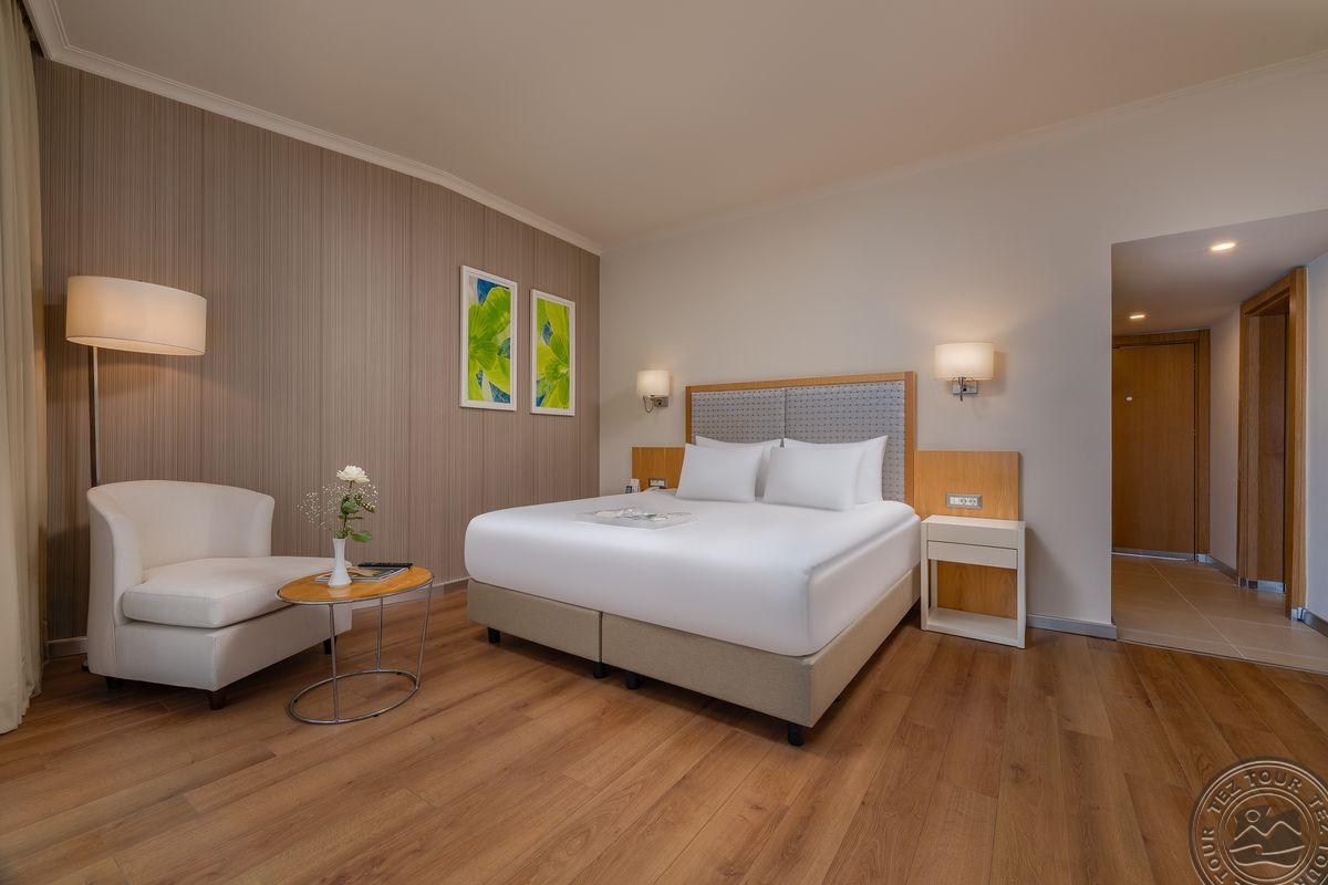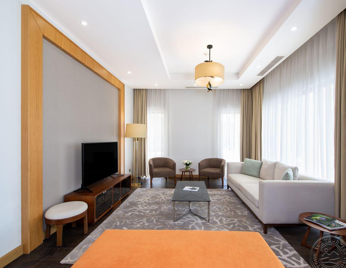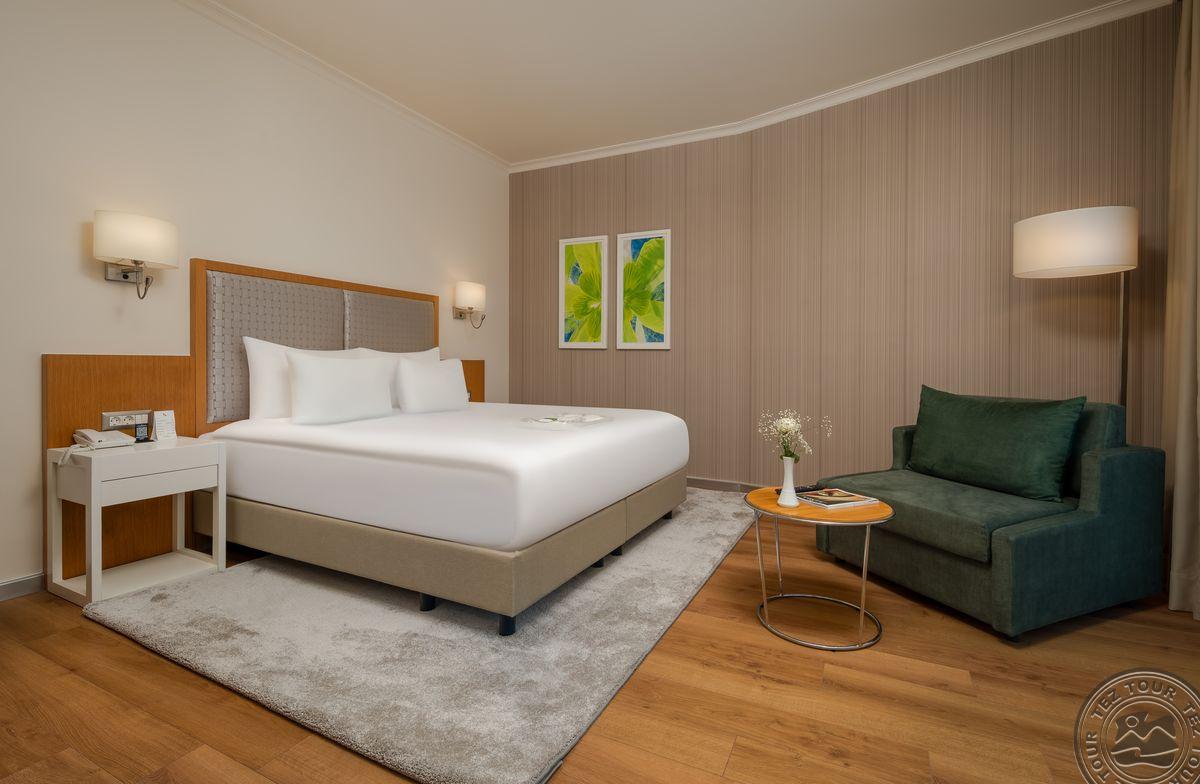 1 trijų kambarių King Suite tipo numeris (svetainė, 2 miegamieji atskirti durimis, individualus kondicionierius, maks. 4+1 asm., 143 m2).