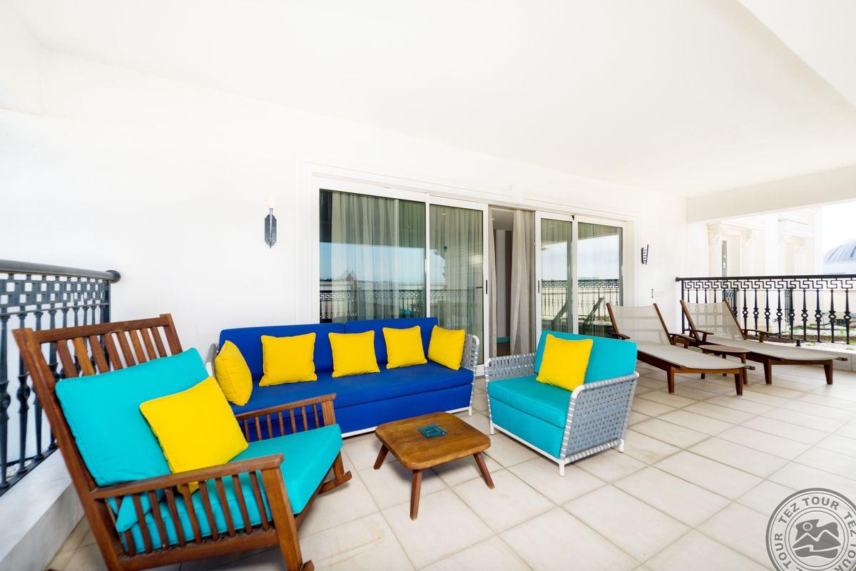 1 trijų kambarių Kingdom suite tipo numeris (svetainė, 2 miegamieji, virtuvės zona, terasa 30 m2, 2 vonios kambariai, sūkurinė vonia, maks. 4+2 asm., 283 m2).