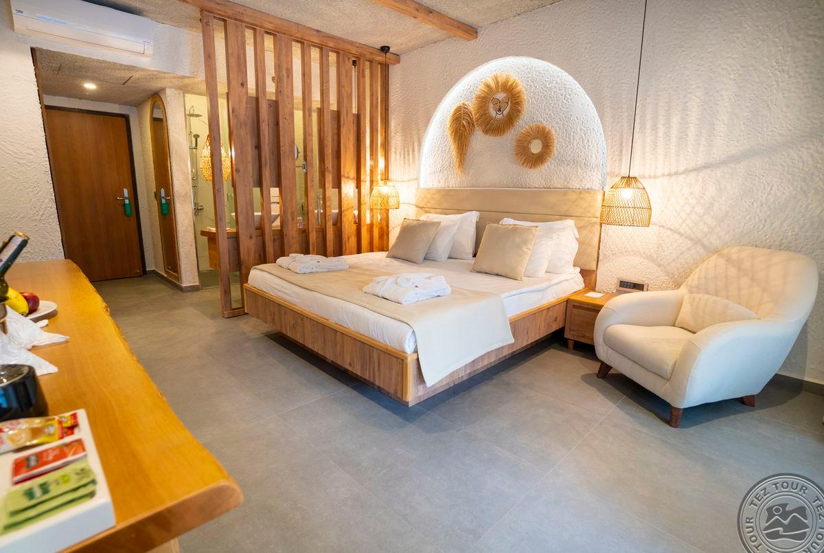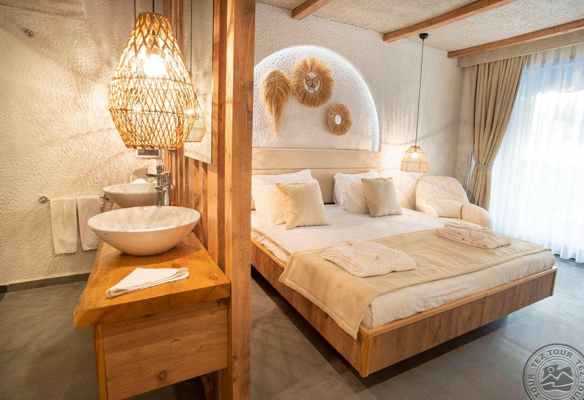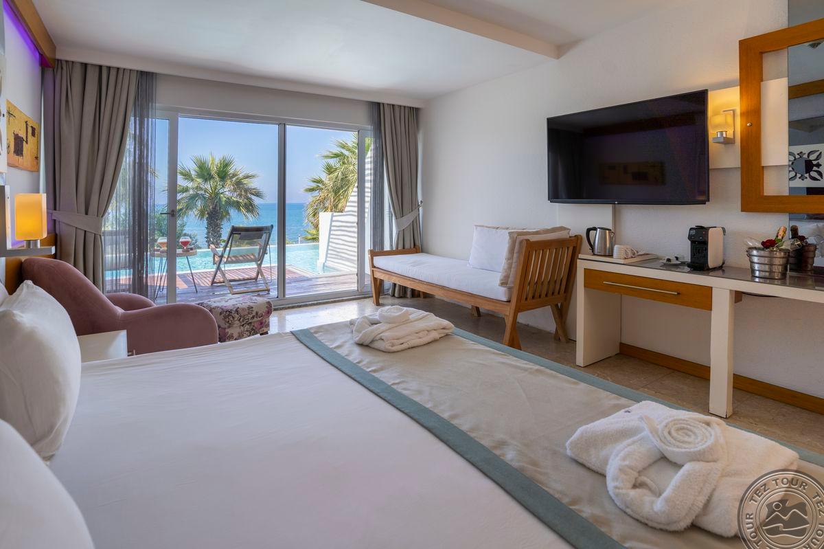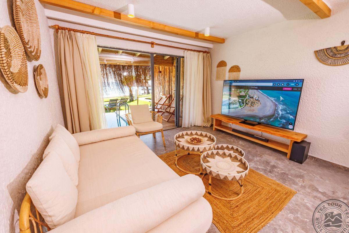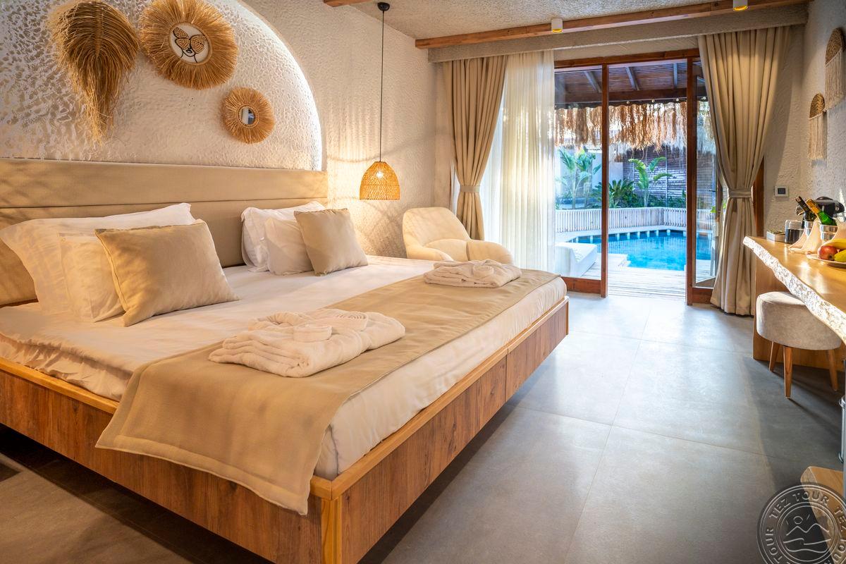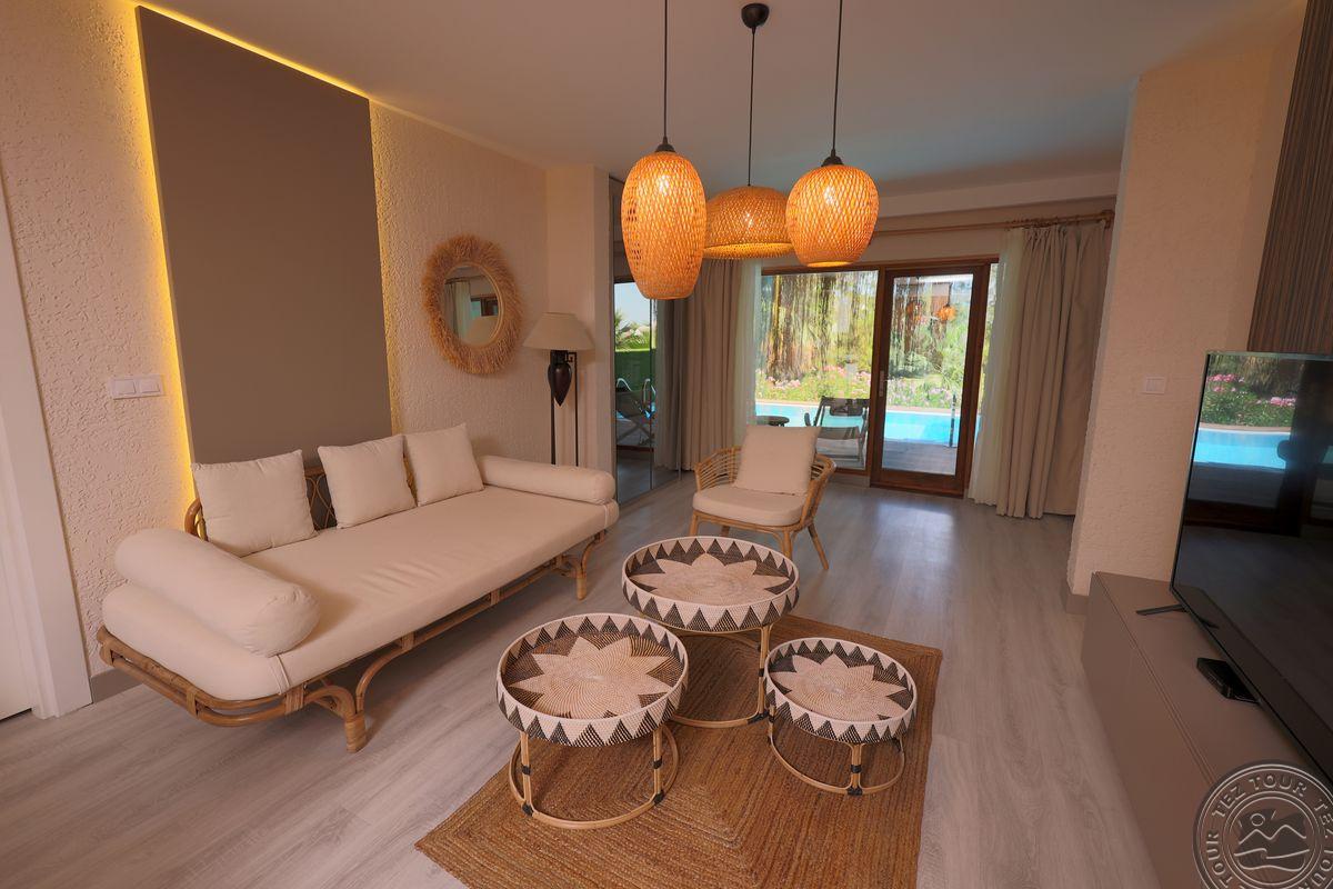 1 dviejų kambarių Presidential Villa tipo numeris(vasarnamiuose, svetainė, miegamasis atskirtas durimis, privatus baseinas, maks. 2 asm., 50 m2).
