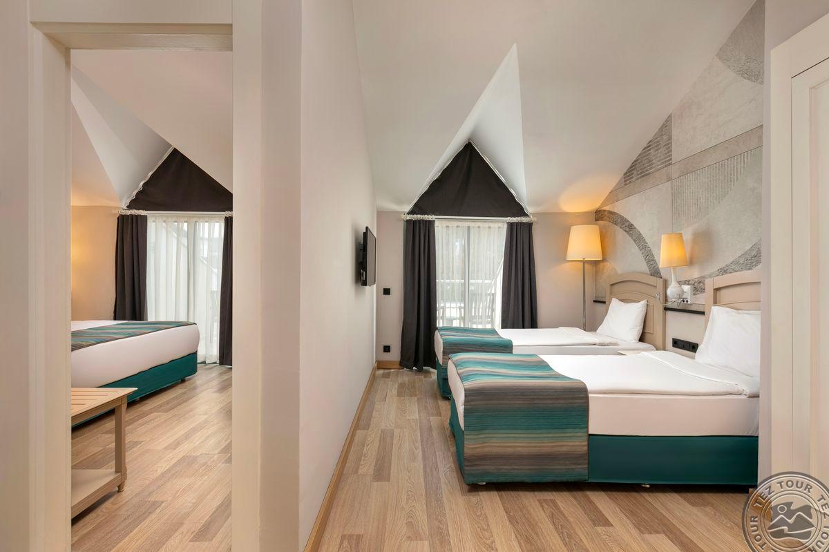 22 dviejų kambarių family room tipo numeriai (2 miegamieji atskirti durimis, maks. 4 asm., 45 m2).