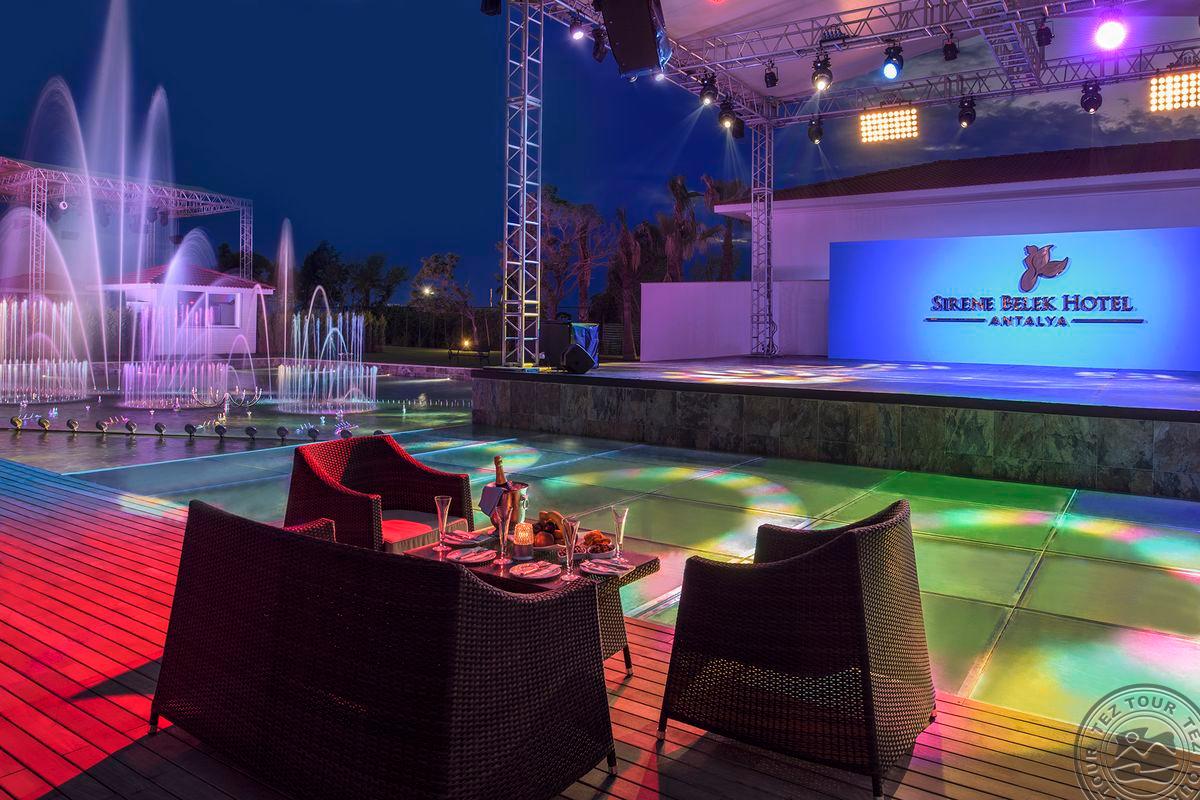 Beleko pakrantėje įsikūrusiame 5* žvaigždučių poilsio komplekse „Sirene Belek Hotel“ įrengti numeriai su balkonais ir terasomis. Teritorijoje yra keletas lauko baseinų, SPA centras su vidaus baseinu ir teniso kortai, bei itin didelė pramogų pasiūla. Rekomenduojamas šeimoms ir poroms.