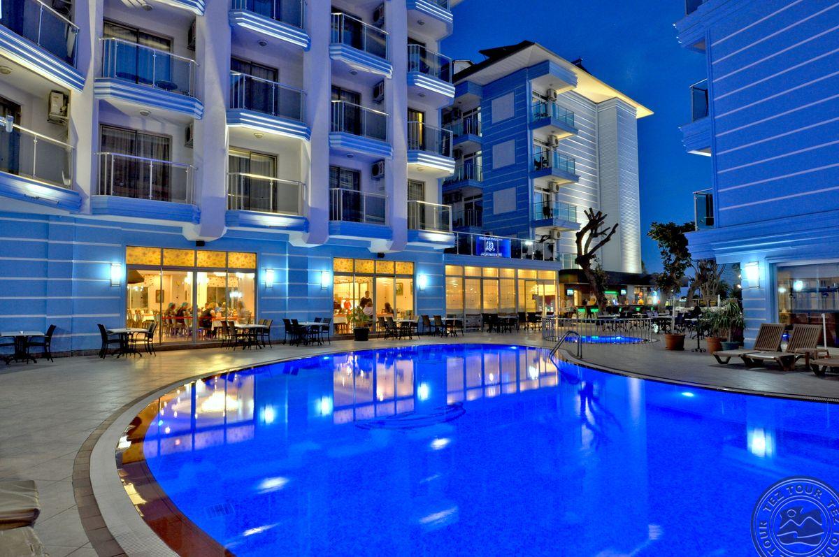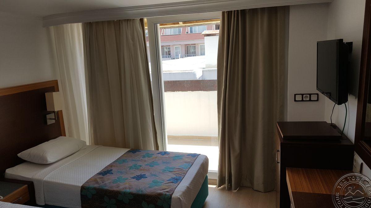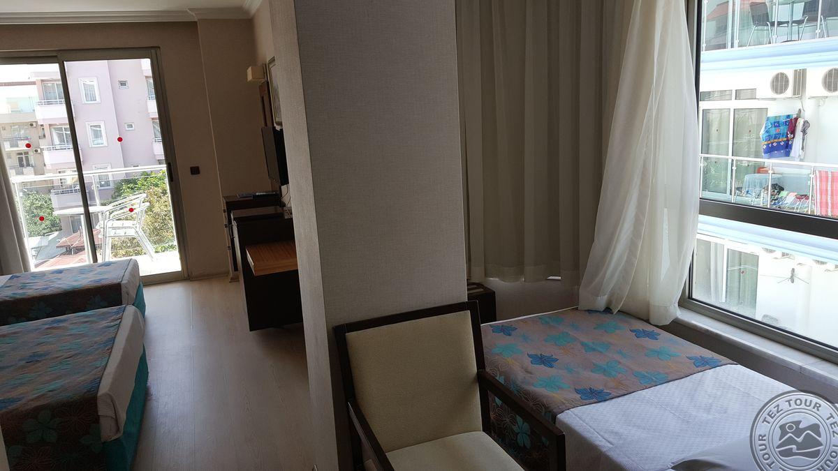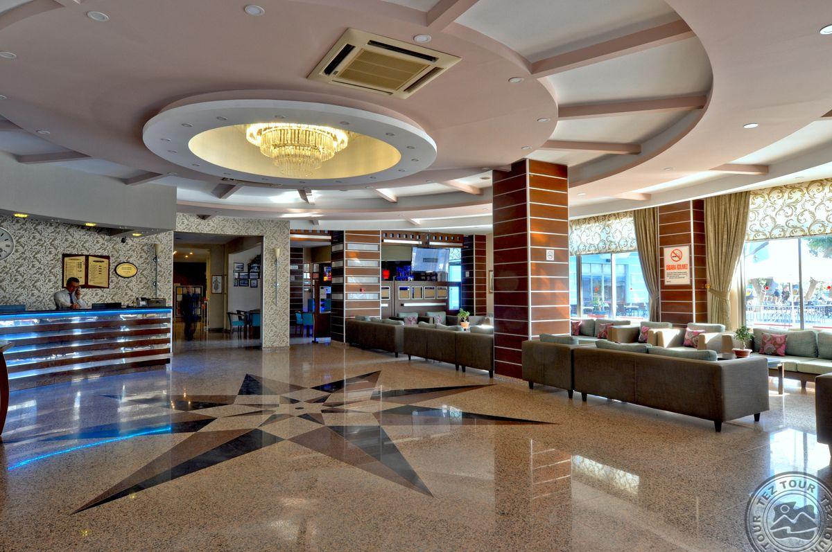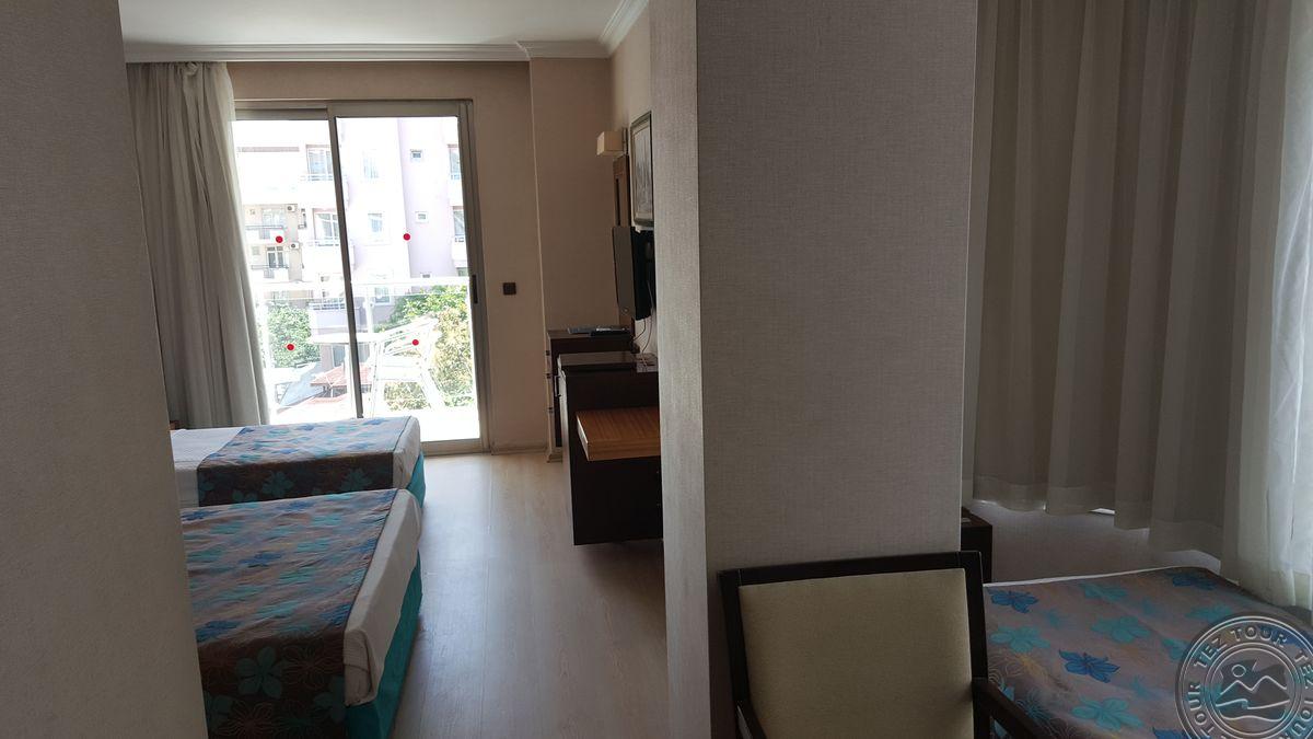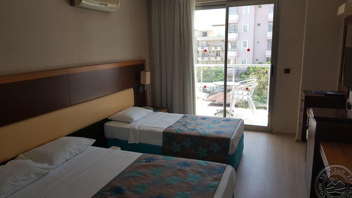 Alanijos centrinėje dalyje įsikūręs, miesto tipo viešbutis su maža teritorija, kurioje pora mažų baseinėlių. Viskas suspausta, bet gan tvarkinga. Kambarių nematėme, nes pilnai užimta. Yra sporto salė, šildomas baseinas viduje. Nemokamas wifi tik lobbyje. Kambaryje internetas 2 EUR/para. Kaip sakė, kambariai senesni, paprastesni nei bendrosios erdvės. Sauna ir Hamam mokamas papildomai.