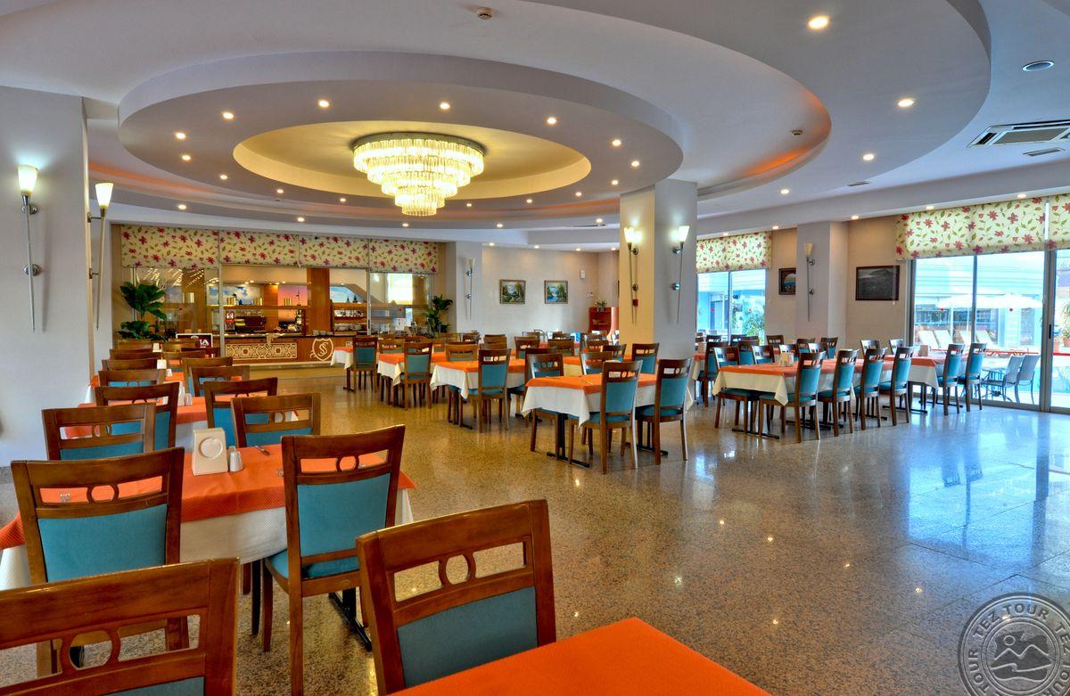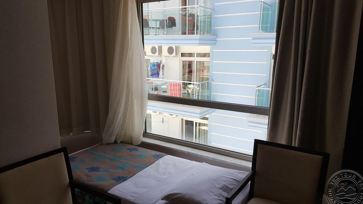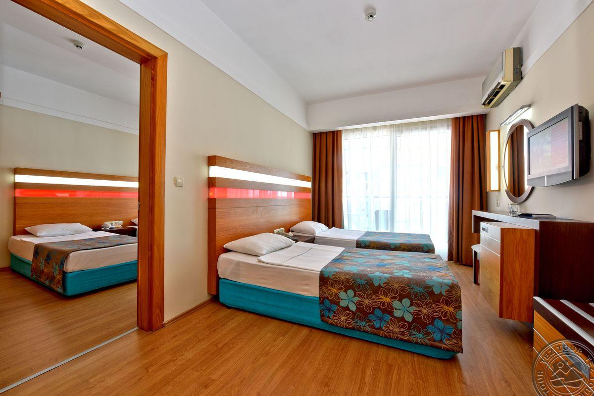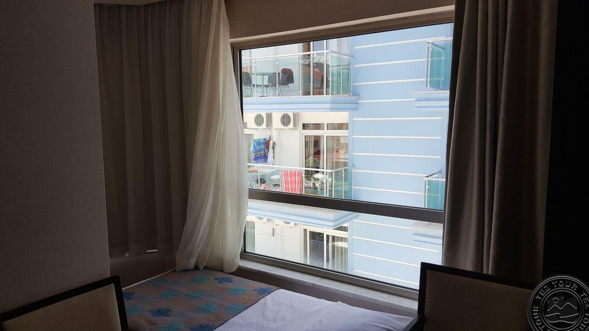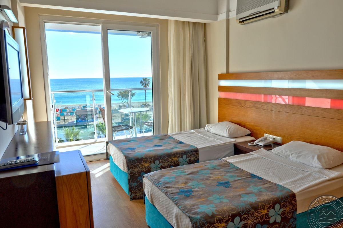 Alanijos centrinėje dalyje įsikūręs, miesto tipo viešbutis su maža teritorija, kurioje pora mažų baseinėlių. Viskas suspausta, bet gan tvarkinga. Kambarių nematėme, nes pilnai užimta. Yra sporto salė, šildomas baseinas viduje. Nemokamas wifi tik lobbyje. Kambaryje internetas 2 EUR/para. Kaip sakė, kambariai senesni, paprastesni nei bendrosios erdvės. Sauna ir Hamam mokamas papildomai.