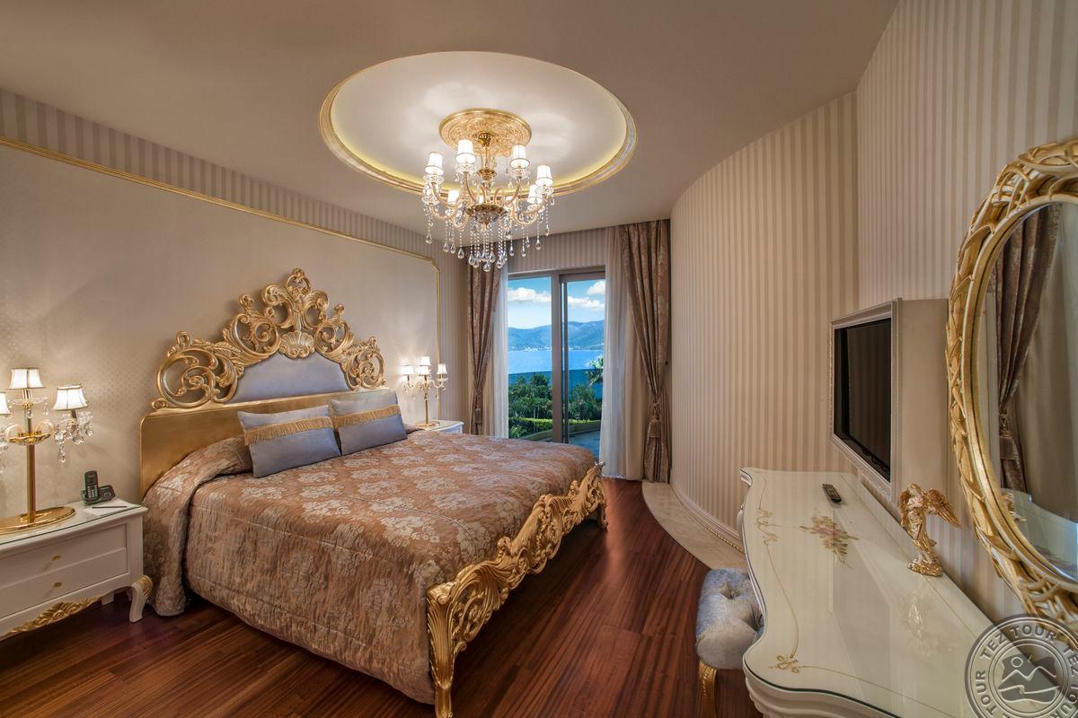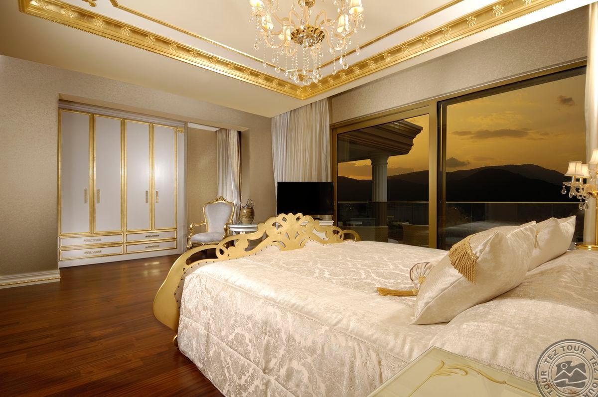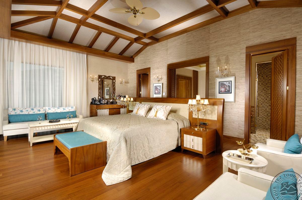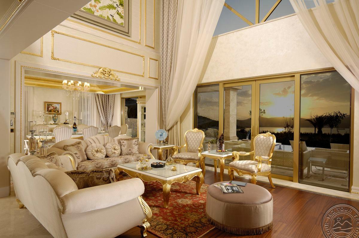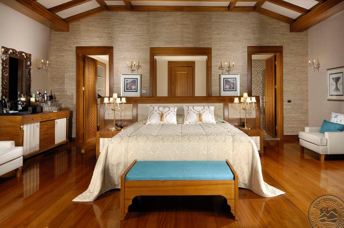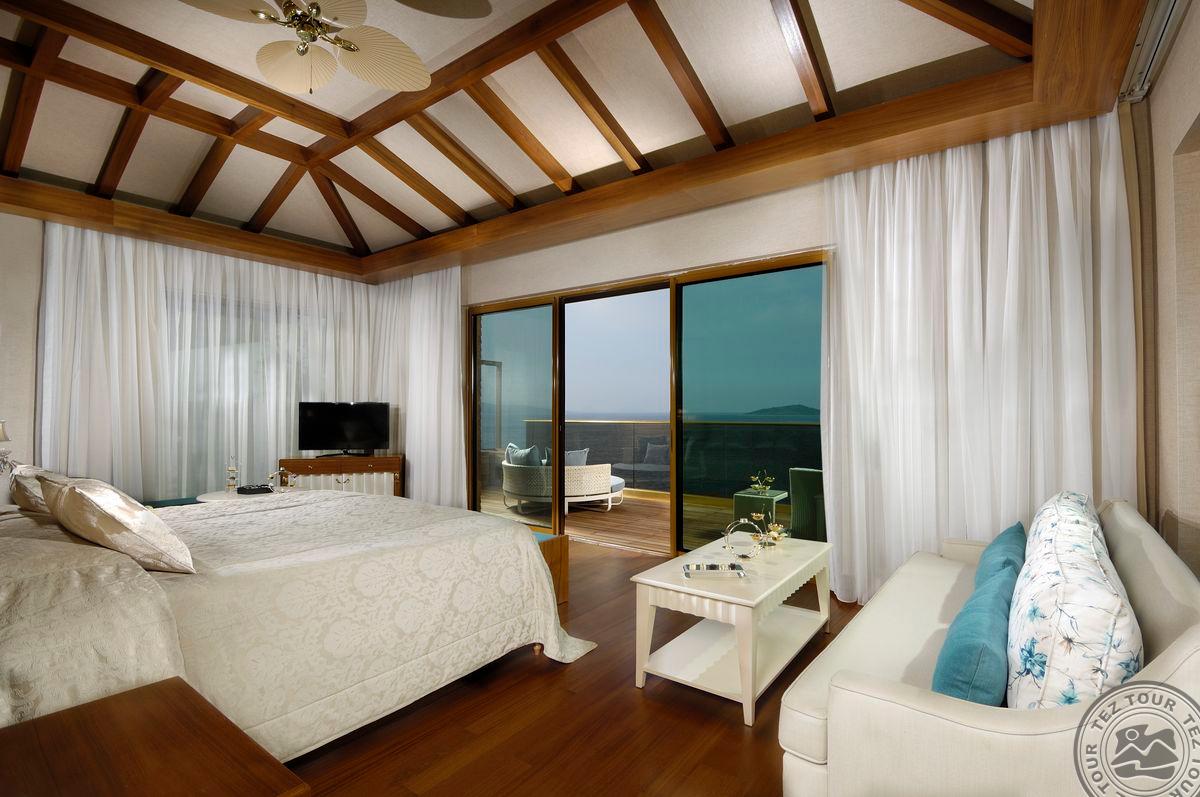 5 Royal Grand Villa tipo vilos (2-jų aukštų vila su liftu, su vaizdu į jūrą; 1-me aukšte: svetainė su įrengta virtuve ir valgomojo zona, miegamasis su dvigule lova, uždaras baseinas + sauna ir hamamas, bėgimo takelis ir dviračio treniruoklis, privatus baseinas, terasa; 2-me aukšte: 2 miegamieji su viengulėmis lovomis, 1 miegamasis su dvigule lova, 1 miegamasis su apvalia dvigule lova ir sūkurine vonia; yra skalbimo masina, maks. 10 asm., 725 m2).