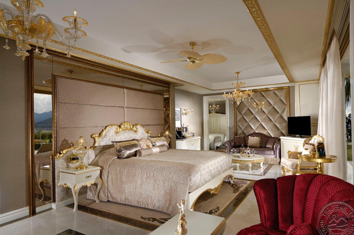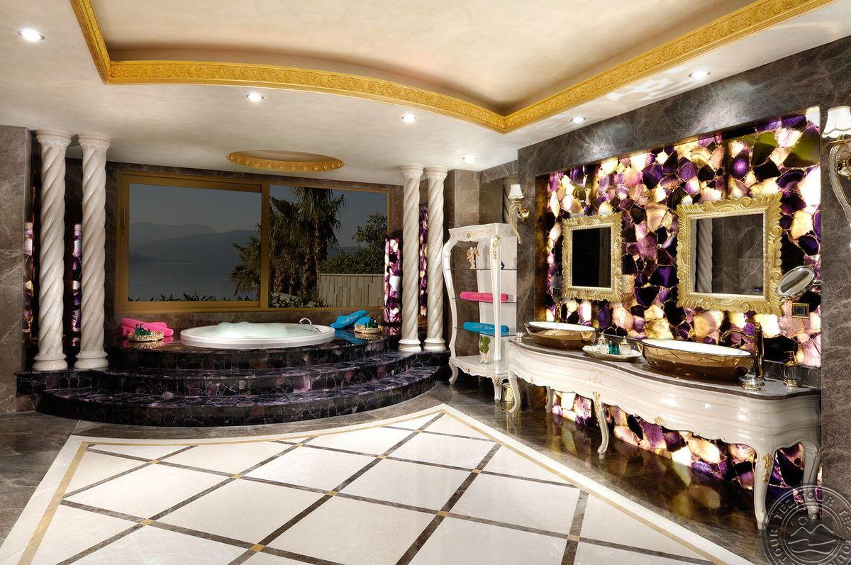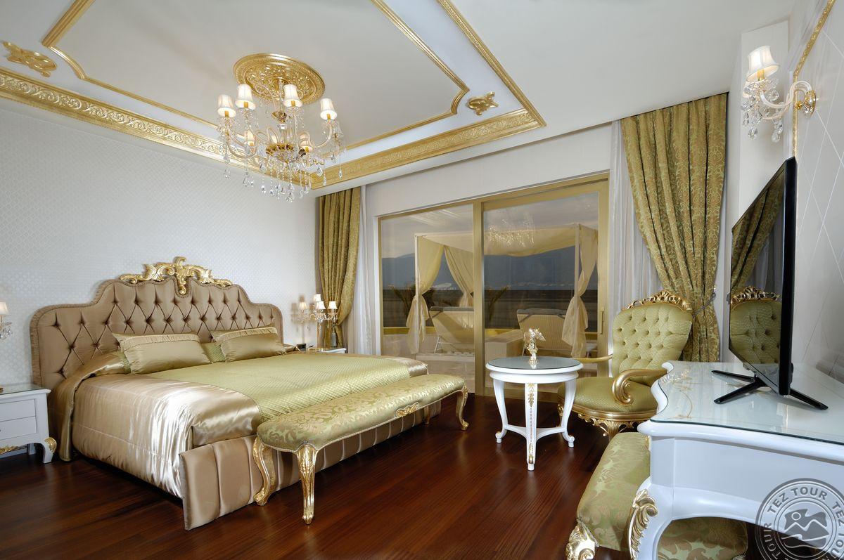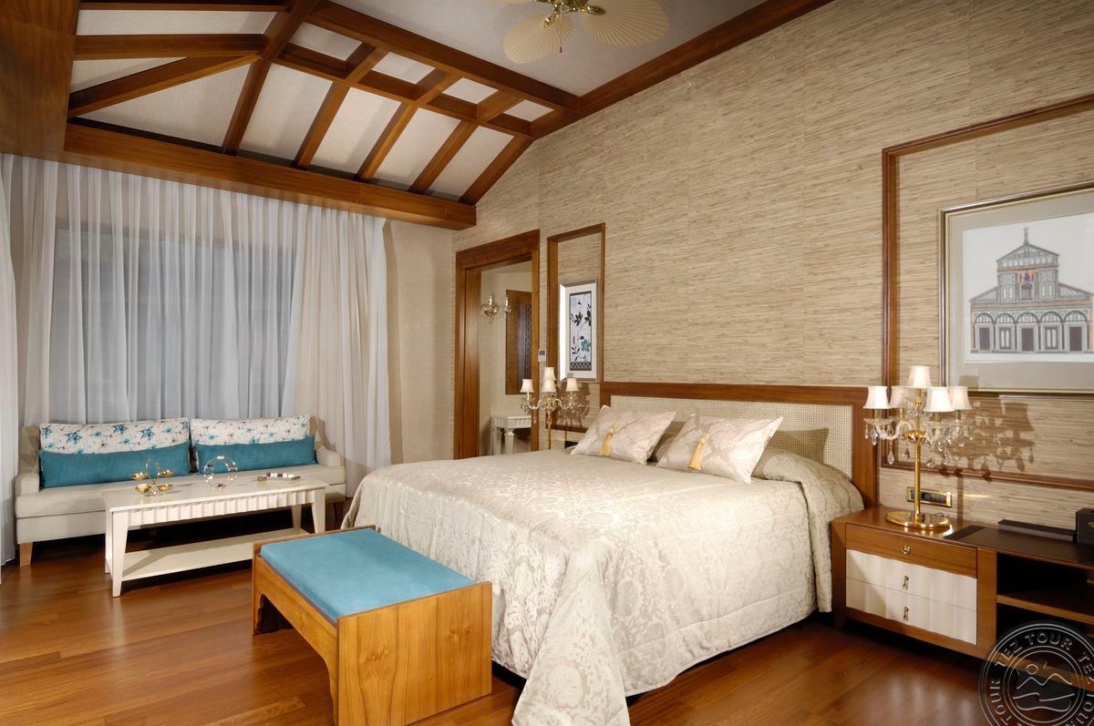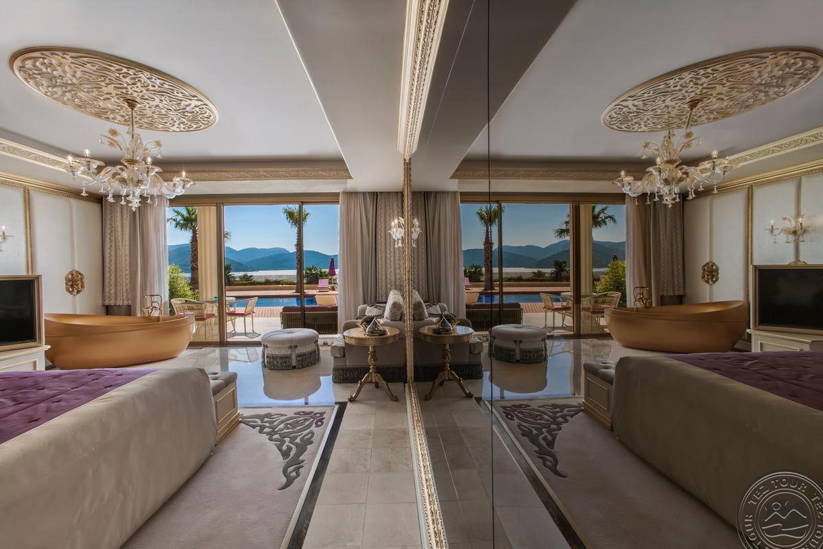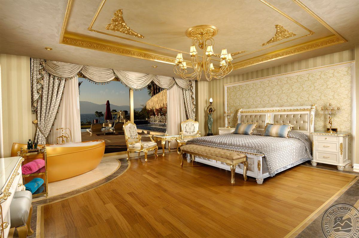 5 Royal Grand Villa tipo vilos (2-jų aukštų vila su liftu, su vaizdu į jūrą; 1-me aukšte: svetainė su įrengta virtuve ir valgomojo zona, miegamasis su dvigule lova, uždaras baseinas + sauna ir hamamas, bėgimo takelis ir dviračio treniruoklis, privatus baseinas, terasa; 2-me aukšte: 2 miegamieji su viengulėmis lovomis, 1 miegamasis su dvigule lova, 1 miegamasis su apvalia dvigule lova ir sūkurine vonia; yra skalbimo masina, maks. 10 asm., 725 m2).