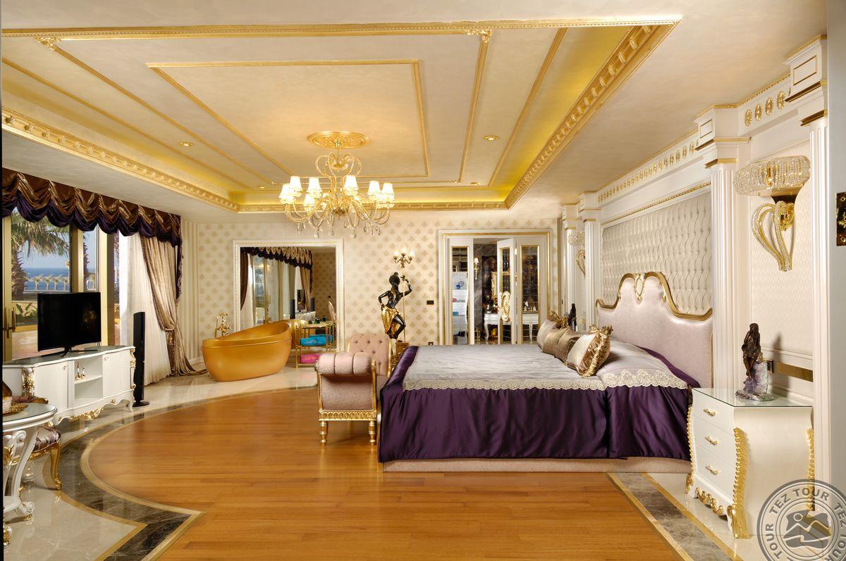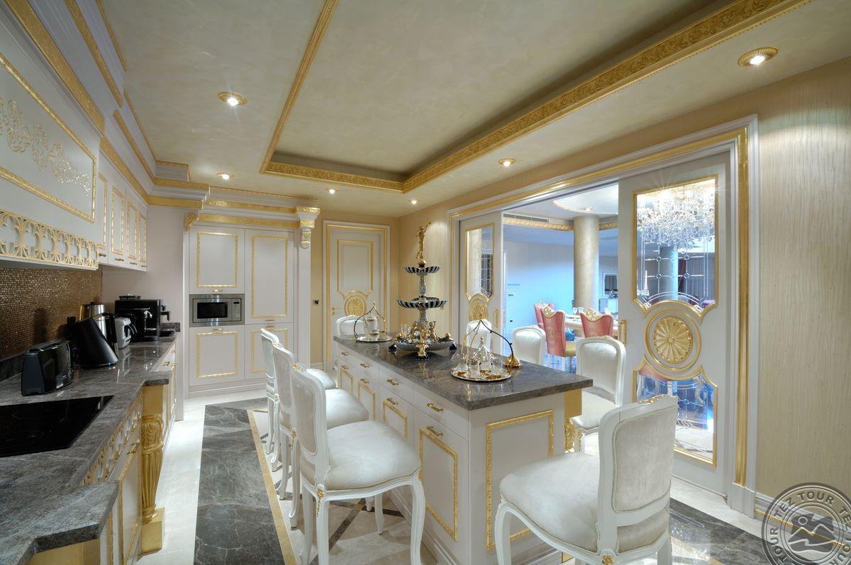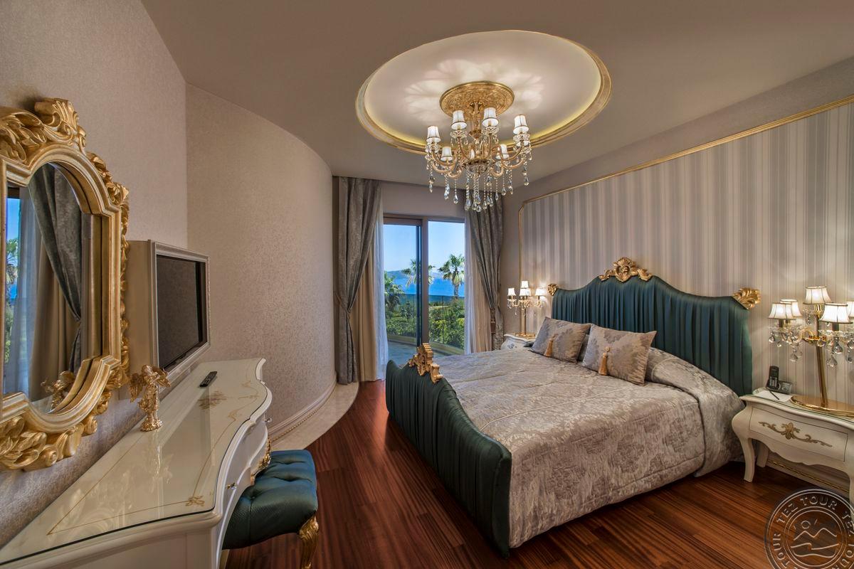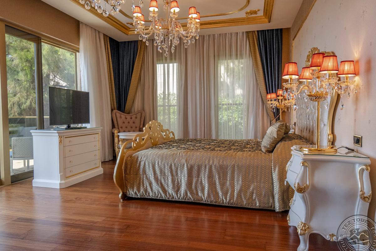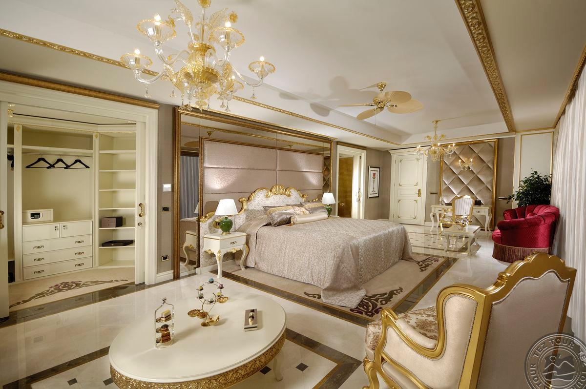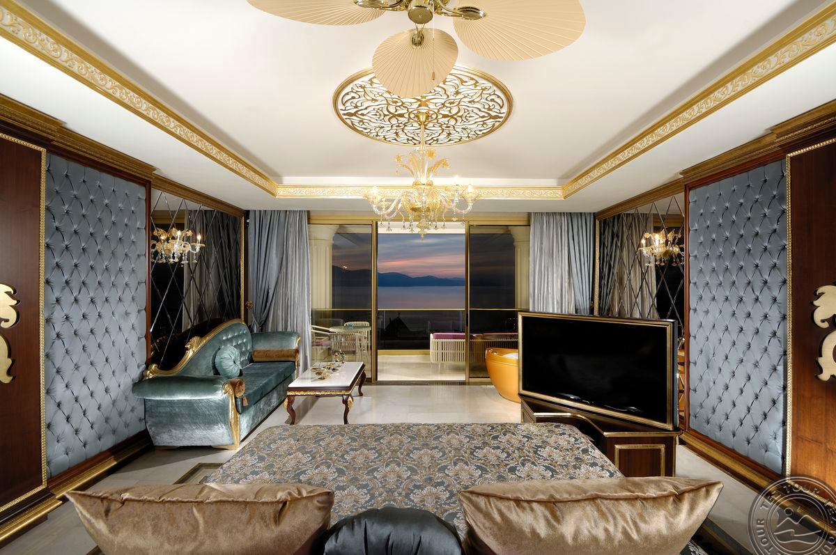 5 Royal Grand Villa tipo vilos (2-jų aukštų vila su liftu, su vaizdu į jūrą; 1-me aukšte: svetainė su įrengta virtuve ir valgomojo zona, miegamasis su dvigule lova, uždaras baseinas + sauna ir hamamas, bėgimo takelis ir dviračio treniruoklis, privatus baseinas, terasa; 2-me aukšte: 2 miegamieji su viengulėmis lovomis, 1 miegamasis su dvigule lova, 1 miegamasis su apvalia dvigule lova ir sūkurine vonia; yra skalbimo masina, maks. 10 asm., 725 m2).