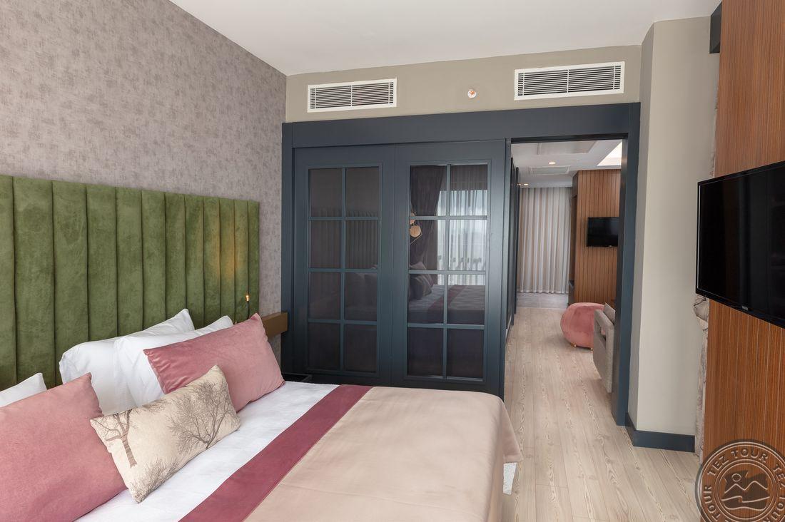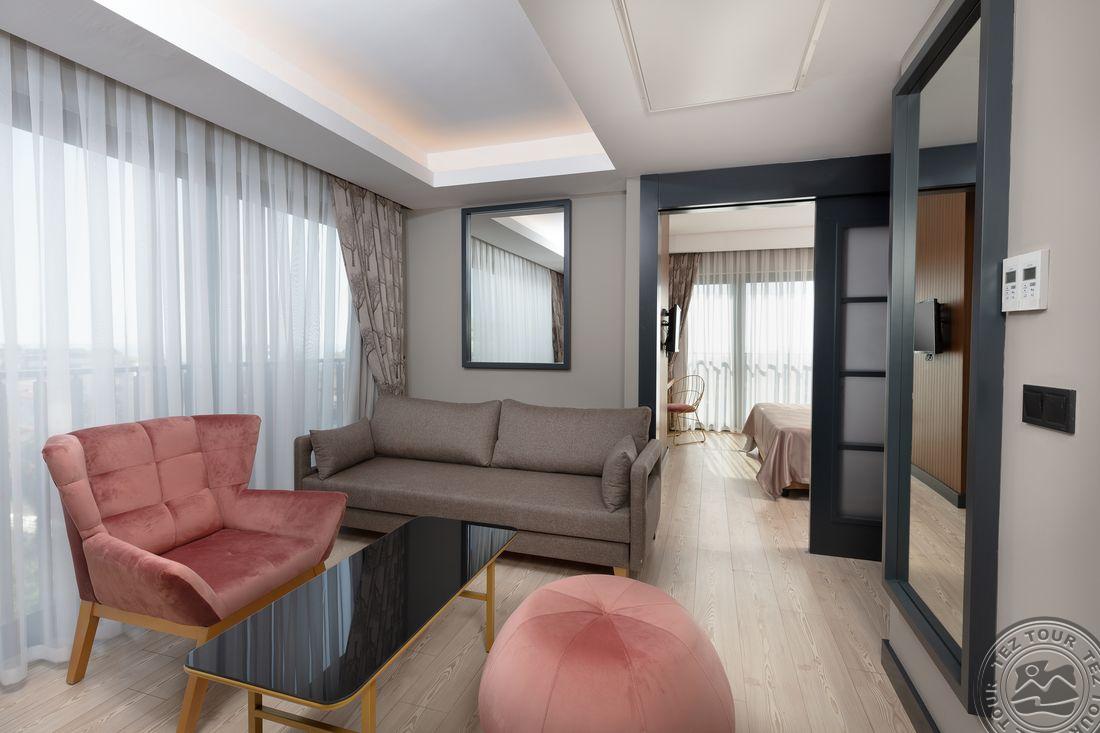21 suite rooms tipo numeris (svetainė ir miegamasis, kambariai neatskirti durimis, maks. 3-4 asm., 40-57 m2);