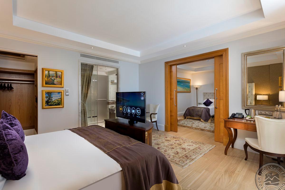 Premium pool duplex suite tipo numeriai (antrame aukšte: 2 miegamieji atskirti durimis, 2 vonios kambariai; pirmame aukšte: mini virtuvė (mažas šaldytuvas, valgomojo stalas); 22 m2 terasa su išėjimu prie baseino su gultais, maks. 5 asm. + kūdikis, 110 m2).