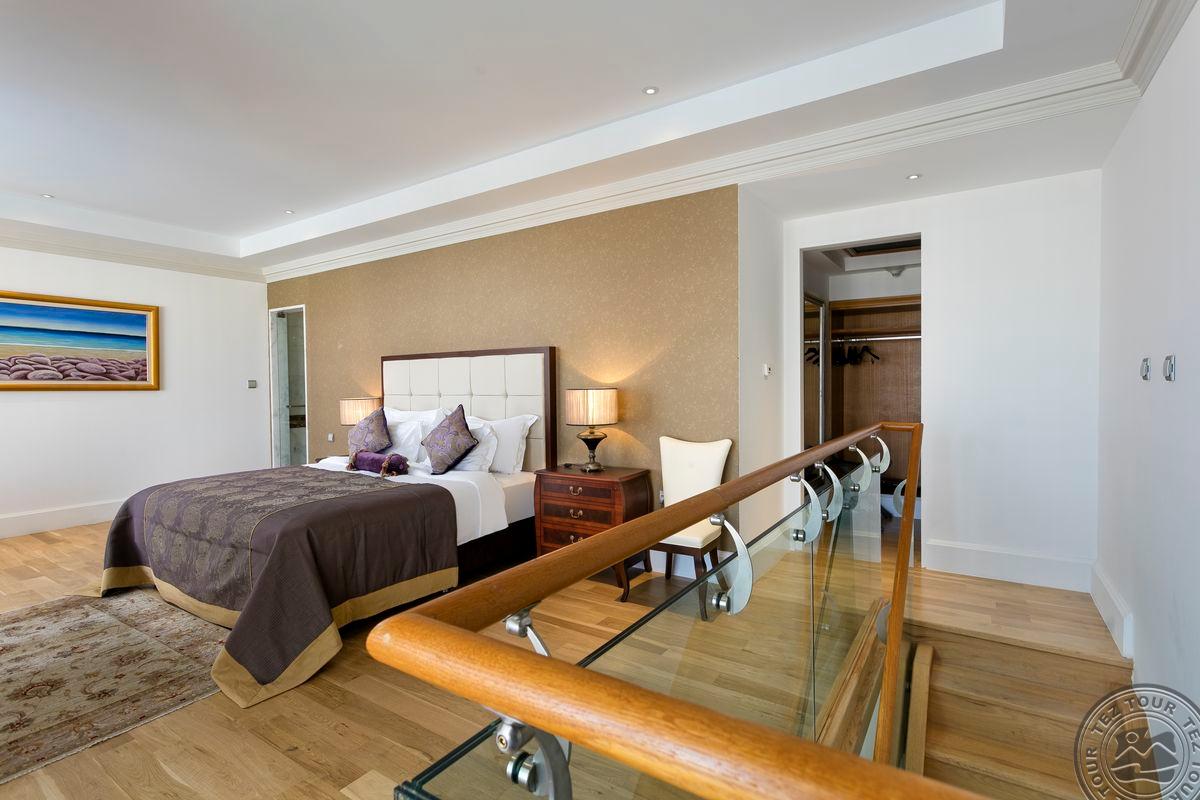 Royal duplex suite tipo numeriai (antrame aukšte: miegamasis, sūkurinė vonia; pirmame aukšte: miegamasis, svetainė, terasa su gultais, pavėsine ir sūkurine vonia; maks. 5 asm. + kūdikis, 145 m2).