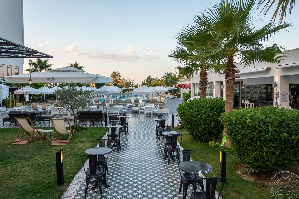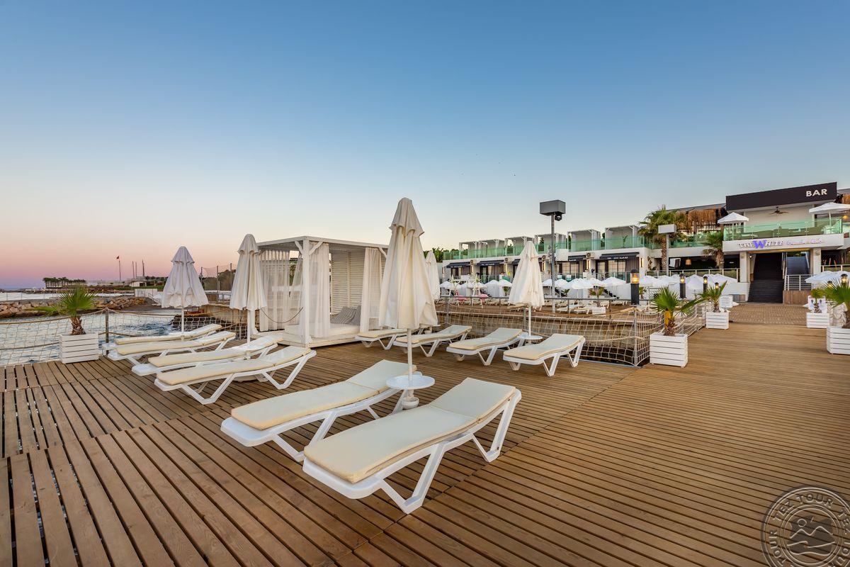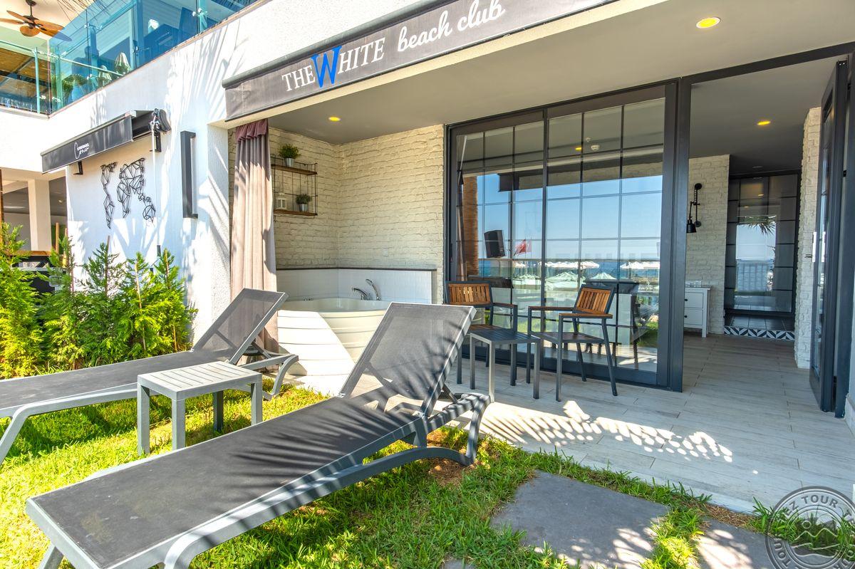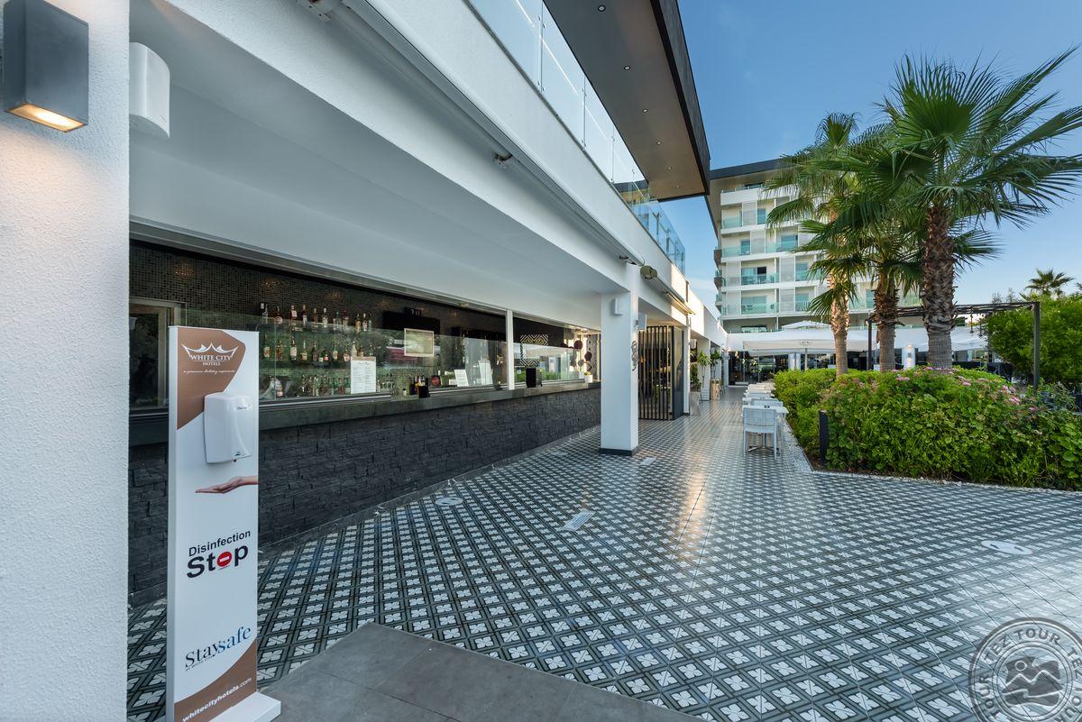 2 yra šio tinklo viešbučiai, White city beach tik suaugusiems, 4* . Paplūdimyje smėlio nedidelis pliažas, pirsas. Fojė mažiukas, tamsu, bet gražu, nauja viskas, groja muzika. Lobby baras 24 h, yra importinių gėrimų. Wifi nemokamai visur, seifas nemokamai. Ala carte 1 kartą nemokamai. 3 iš viso ala carte, 1 pliaže, 2 prie baseino. 240 kambarių, 9 Premier kambariai paplūdimyje tik suaugusiems. Yra infinity baseinas prie jūros, šildomas 04.01-05.15 ir rudenį. 2014 m. atidarytas, 2022 m. renovuotas paskutinį kartą, kasmet atsinaujina, šiemet dauguma kambarių renovuota. Standart kambarys nuo 2 aukšto, side sea view kambariais, normalus, tvarkingas, erdvesnis, max 3 asm. Family 2 miegamieji su durim, 2 san mazgai, daug vietos, max 6 asm, bet 5 patogiau. Yra kalneliai suaugusiems. Yra gatvės maisto kioskeliai. Žalia, graži, siaura, moderni teritorija aplinka. Prie jūros pirsas didelis ir šalia gabaliukas smėlio kranto. Beach kambarys erdvus, mini baras kasdien papildomas, ala carte nemokamai šitam kambariui, max 2 ams. Paviljonai ant pirso galo mokami, kur arčiau baro nemokamai. Šalia viešbučio yra visokių turgelių, parduotuvių.