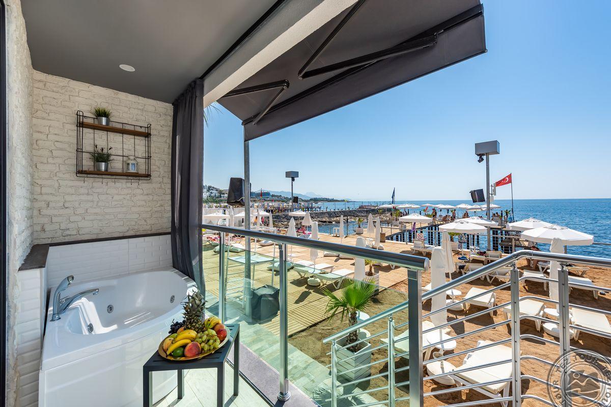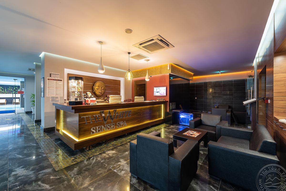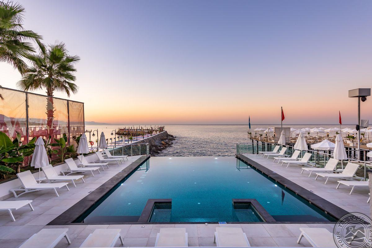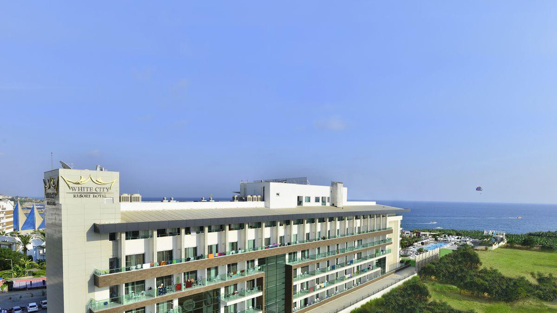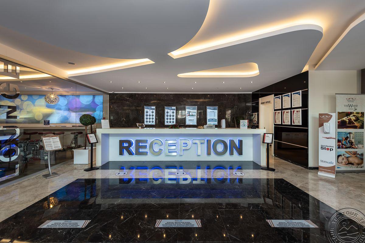 2 yra šio tinklo viešbučiai, White city beach tik suaugusiems, 4* . Paplūdimyje smėlio nedidelis pliažas, pirsas. Fojė mažiukas, tamsu, bet gražu, nauja viskas, groja muzika. Lobby baras 24 h, yra importinių gėrimų. Wifi nemokamai visur, seifas nemokamai. Ala carte 1 kartą nemokamai. 3 iš viso ala carte, 1 pliaže, 2 prie baseino. 240 kambarių, 9 Premier kambariai paplūdimyje tik suaugusiems. Yra infinity baseinas prie jūros, šildomas 04.01-05.15 ir rudenį. 2014 m. atidarytas, 2022 m. renovuotas paskutinį kartą, kasmet atsinaujina, šiemet dauguma kambarių renovuota. Standart kambarys nuo 2 aukšto, side sea view kambariais, normalus, tvarkingas, erdvesnis, max 3 asm. Family 2 miegamieji su durim, 2 san mazgai, daug vietos, max 6 asm, bet 5 patogiau. Yra kalneliai suaugusiems. Yra gatvės maisto kioskeliai. Žalia, graži, siaura, moderni teritorija aplinka. Prie jūros pirsas didelis ir šalia gabaliukas smėlio kranto. Beach kambarys erdvus, mini baras kasdien papildomas, ala carte nemokamai šitam kambariui, max 2 ams. Paviljonai ant pirso galo mokami, kur arčiau baro nemokamai. Šalia viešbučio yra visokių turgelių, parduotuvių.