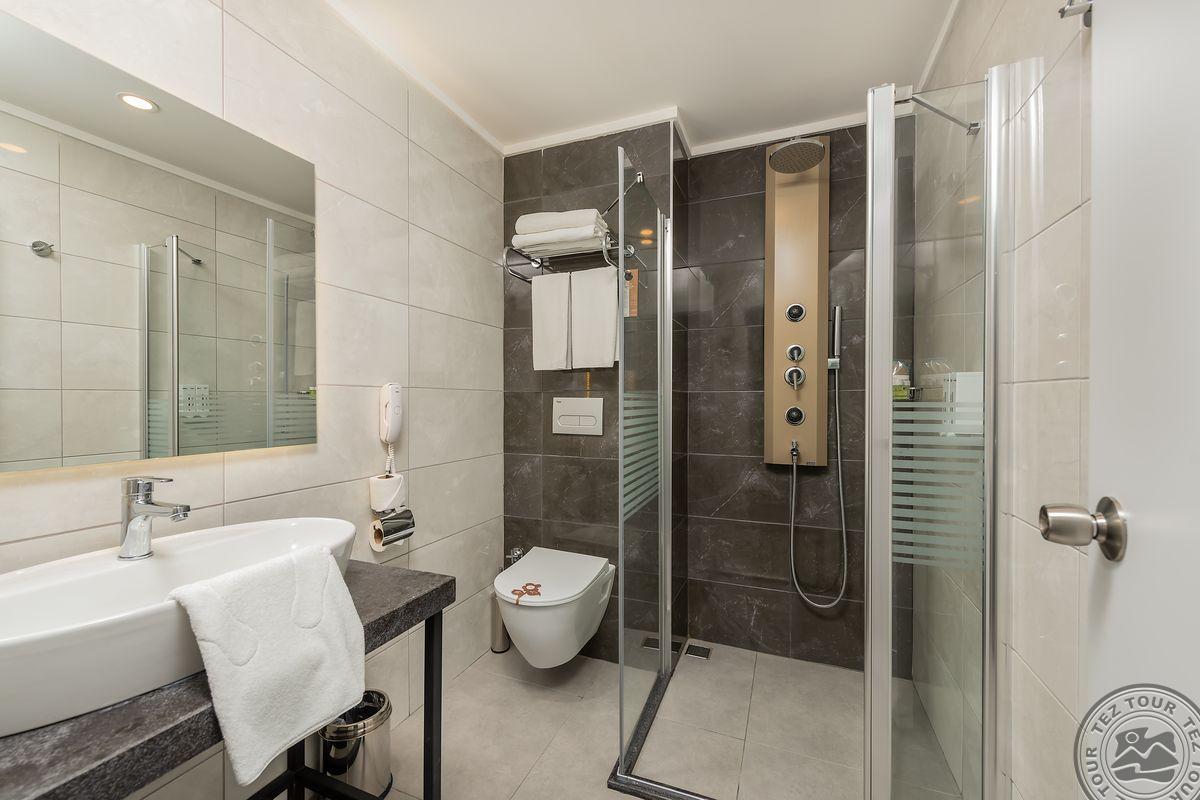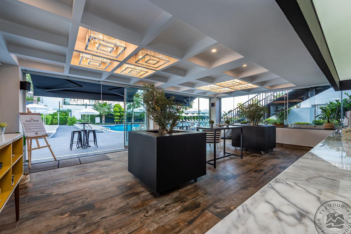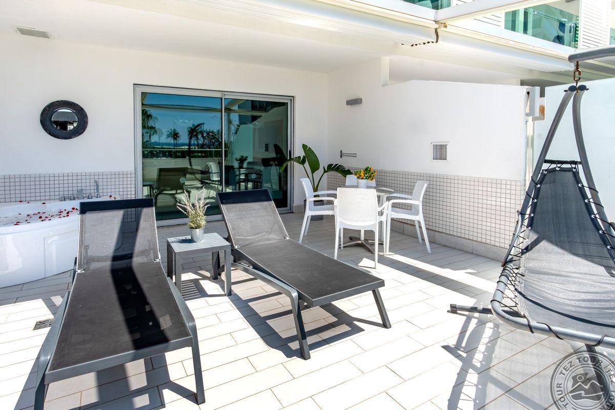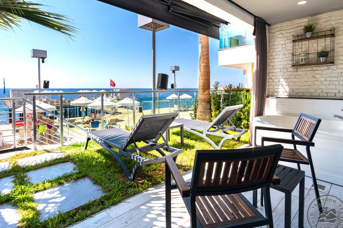 2 yra šio tinklo viešbučiai, White city beach tik suaugusiems, 4* . Paplūdimyje smėlio nedidelis pliažas, pirsas. Fojė mažiukas, tamsu, bet gražu, nauja viskas, groja muzika. Lobby baras 24 h, yra importinių gėrimų. Wifi nemokamai visur, seifas nemokamai. Ala carte 1 kartą nemokamai. 3 iš viso ala carte, 1 pliaže, 2 prie baseino. 240 kambarių, 9 Premier kambariai paplūdimyje tik suaugusiems. Yra infinity baseinas prie jūros, šildomas 04.01-05.15 ir rudenį. 2014 m. atidarytas, 2022 m. renovuotas paskutinį kartą, kasmet atsinaujina, šiemet dauguma kambarių renovuota. Standart kambarys nuo 2 aukšto, side sea view kambariais, normalus, tvarkingas, erdvesnis, max 3 asm. Family 2 miegamieji su durim, 2 san mazgai, daug vietos, max 6 asm, bet 5 patogiau. Yra kalneliai suaugusiems. Yra gatvės maisto kioskeliai. Žalia, graži, siaura, moderni teritorija aplinka. Prie jūros pirsas didelis ir šalia gabaliukas smėlio kranto. Beach kambarys erdvus, mini baras kasdien papildomas, ala carte nemokamai šitam kambariui, max 2 ams. Paviljonai ant pirso galo mokami, kur arčiau baro nemokamai. Šalia viešbučio yra visokių turgelių, parduotuvių.