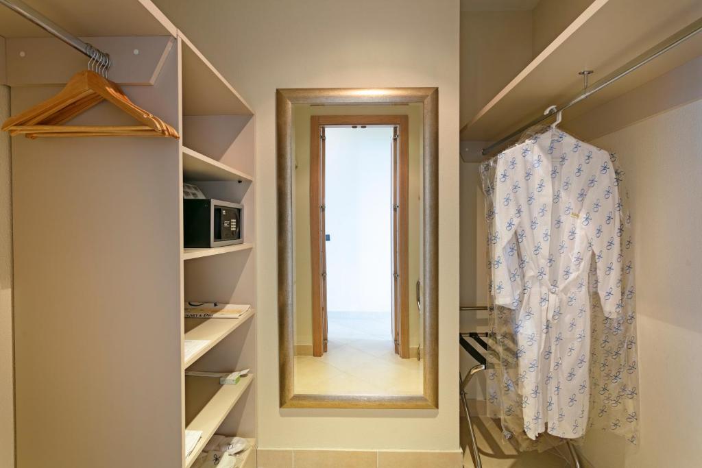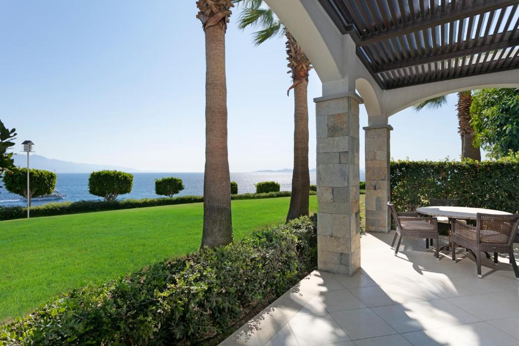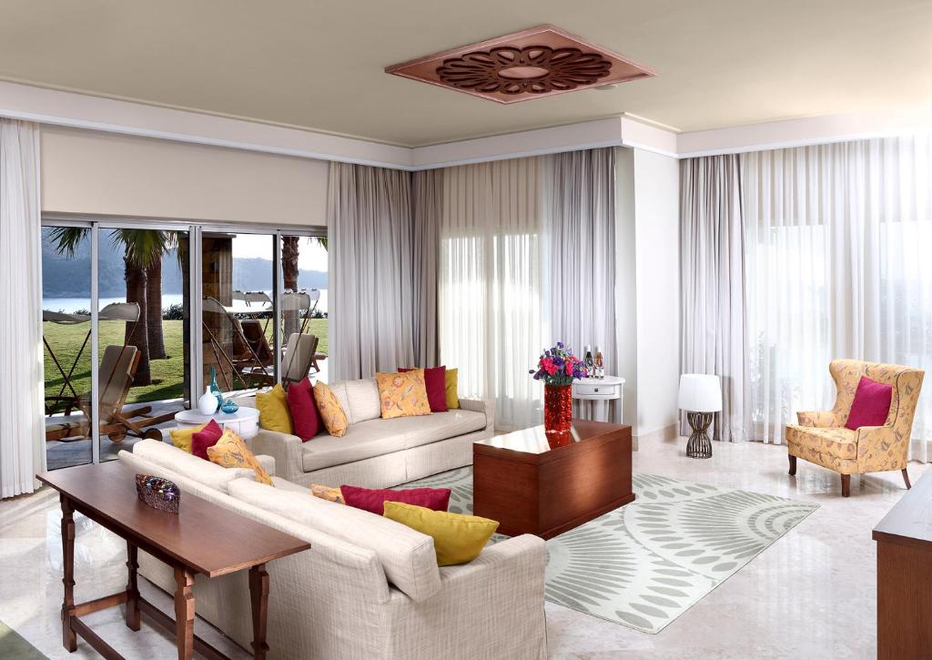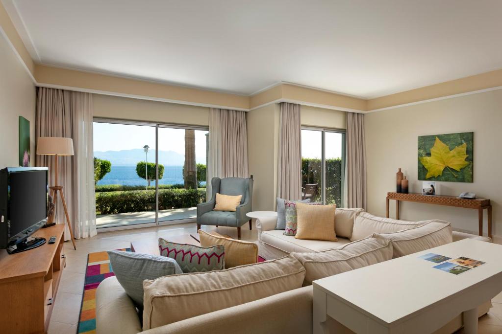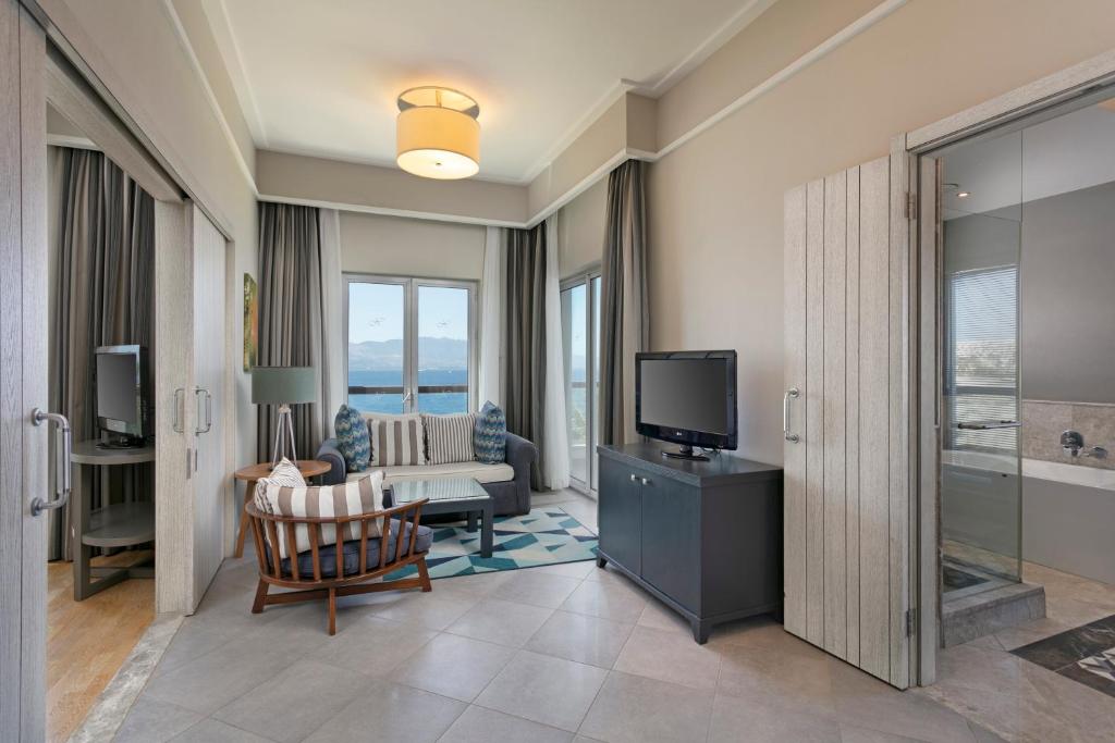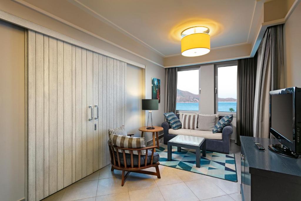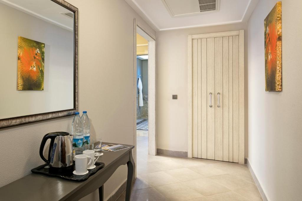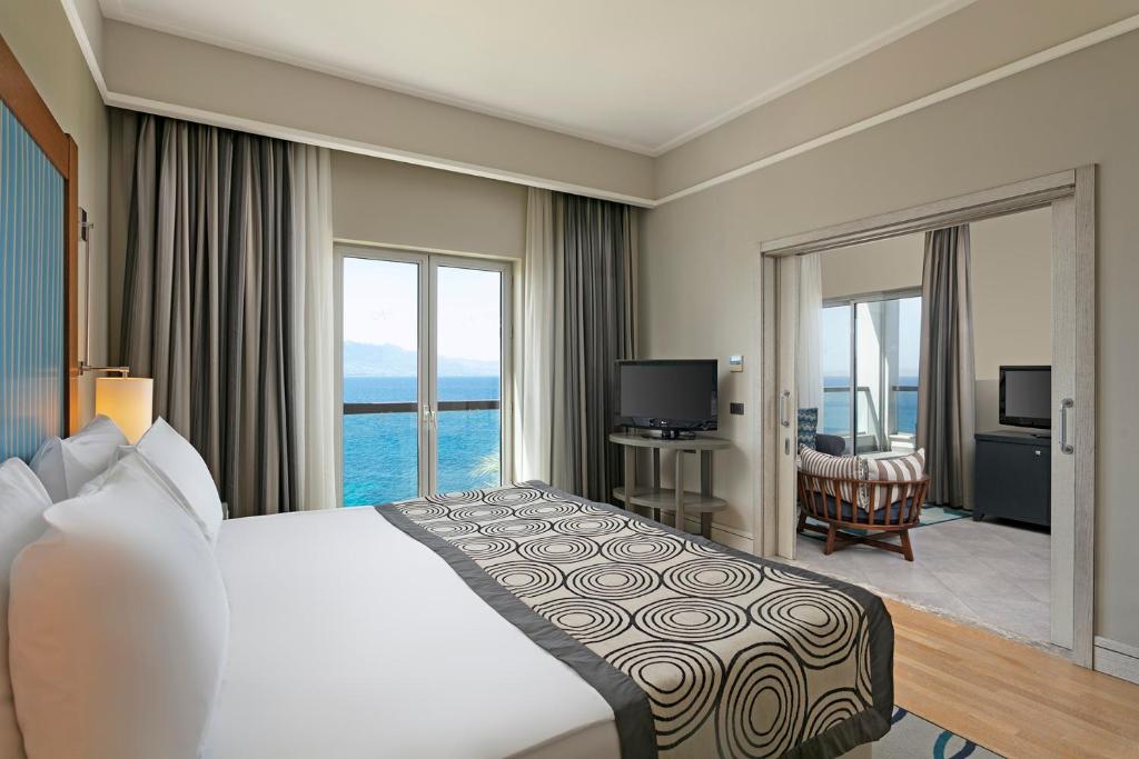 Kambariai: erdvūs ir šviesūs. Gyvenome Elegance Suite su dviem miegamaisiais, dviem vonios kambariais ir didele svetaine su sofa bei darbo zona. Vienas vonios kambarys su vonia ir dušu, kitas - su dušu ir tualetu. Taip pat kambarys turėjo balkoną su dviem gultais ir taip pat puikiu vaizdu į jūrą. Maistas vidutinis, privalgydavome, bet nieko ypatingo. Jūra: labai švarus vanduo, dugne - akmenys. Yra 2 prieplaukos, kuriose galima palikti daiktus, yra gultai ir, žinoma, paplūdimio zona su smulkiais akmenukais. Patogumai: 2 baseinai (nešildomi) su barais. Kavinių-barų, a la carte restoranų ir kavos zonų pasirinkimas. Taip pat didelė vaikų zona su vaikų klubu. Kelionė iki oro uosto trunka apie valandą.
