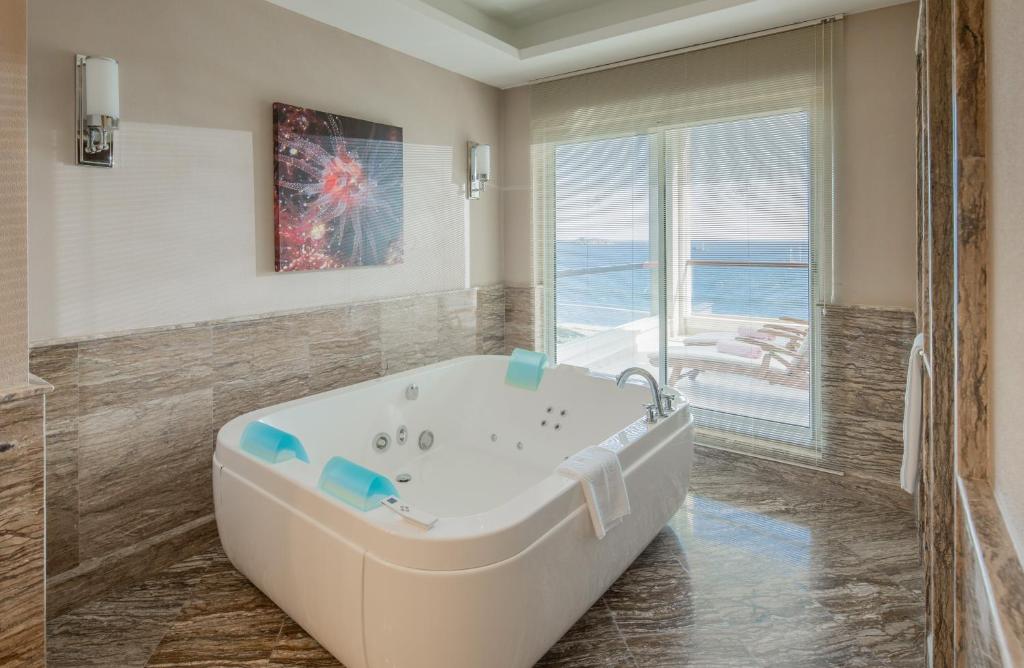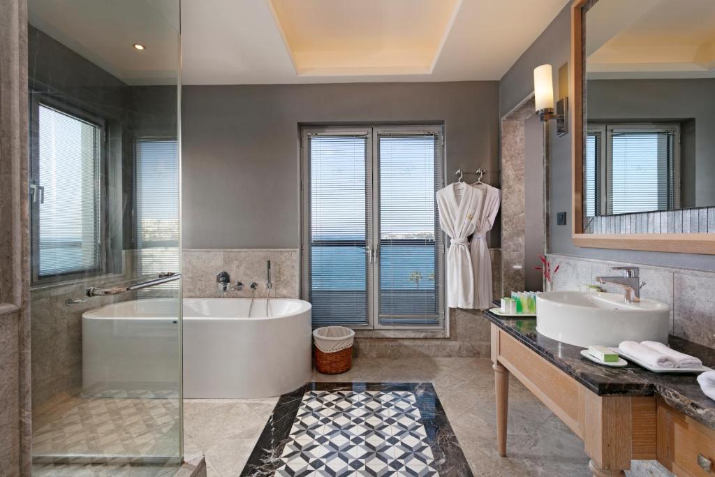 Royal Suite tipo numeriai (3 miegamieji atskirti durimis (dvigulė lova ir 2 miegamieji su 2 viengulėmis lovomis), svetainė, darbo kambarys, 3 vonios kambariai, sūkurinė vonia, 2 terasos, gultai, maks. 6+2 arba 7 asm., 238 m2, privilegijos).