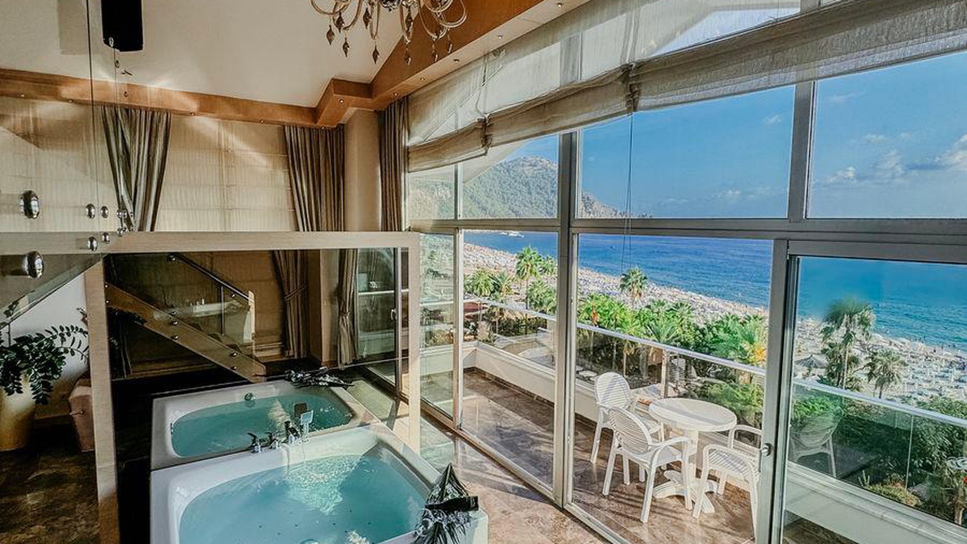 Deluxe Loft Room tipo numeris (dviaukštis numeris, su vaizdu į jūrą, dvigulė lova, sofa, sūkurinė vonia kambaryje, mini virtuvė, 3 vonios kambariai, maks. 3 asm., 55 kv.m+balkonas 11 kv.m).