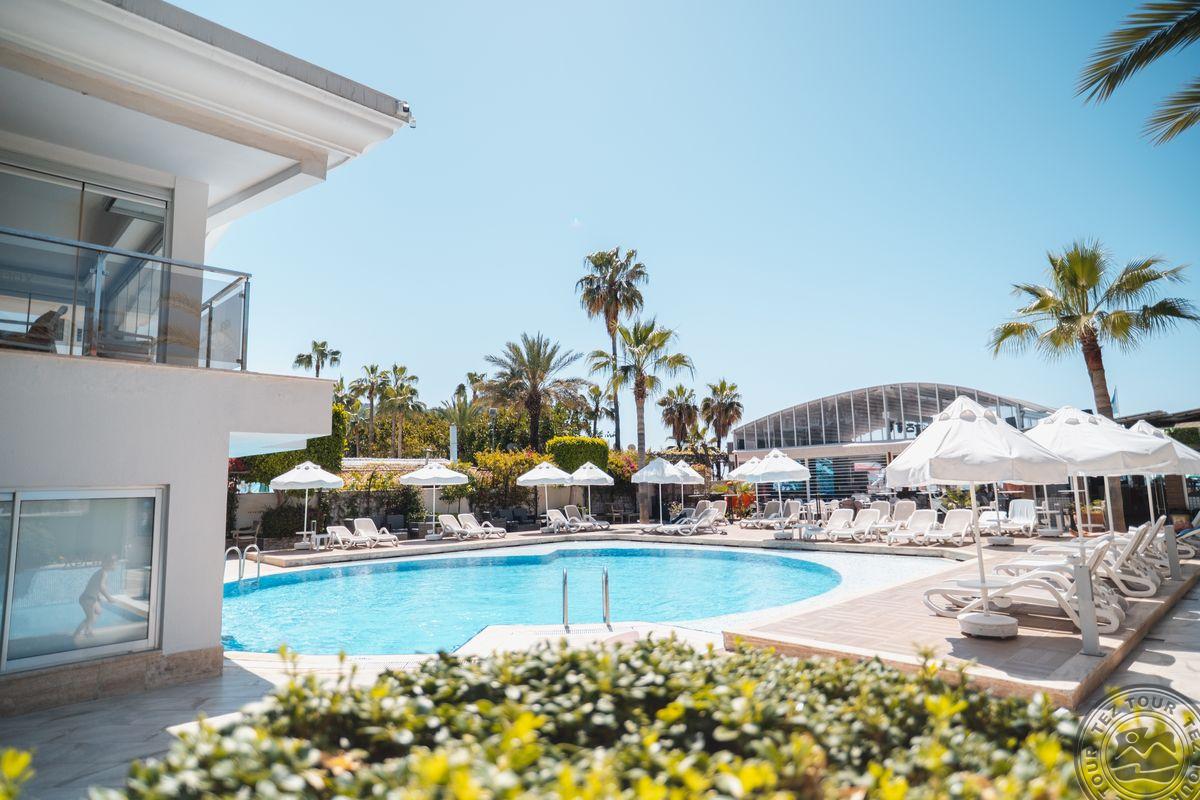 Miesto viešbutis Alanijos centre, skirtas tiems, kurie keliaus, o ne tik bus viešbutyje. Pritaikytas neįgaliesiems. Rekomenduojamas suaugusiems, poroms, nepriima vaikų iki 7 m. Viešbutis dirba visus metus, turi visus saugumo sertifikatus. Viduje nekvepia. Siaura, tamsi registratūra. Standartinis kambarys mažas, mini bare – vanduo ir sultys (nepildoma), į kambarį maisto neštis negalima. Ekonominiai kambariai mažesni už standartinius, su prancūzišku balkonu. Suite tipo numeriai turi 2 kambarius, prancūzišką balkoną. Nedidelė teritorija. Dienos metu groja rami muzika. Baseinas nedidelis, rytais jame vyksta mankšta. Renginiai vyksta kiekvieną vakarą. Maisto pasirinkimas nedidelis, bet skanu, daug daržovių. Yra à la carte restoranas. Paplūdimy vakare, per saulėlydį, gali padengti stalą (55 €/2 asm.). Platus paplūdimys, smėlio – žvyro, užtektinai gultų, paplūdimio baras dirba 10-24 val. Kartais paplūdimy vyksta joga.